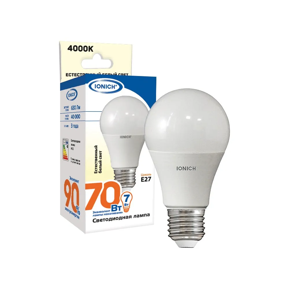 Цены на похожие товары Ionich, 4000 K, 630 Лм, 80 Ra, 7 Вт, A, 220 В, e27, шар