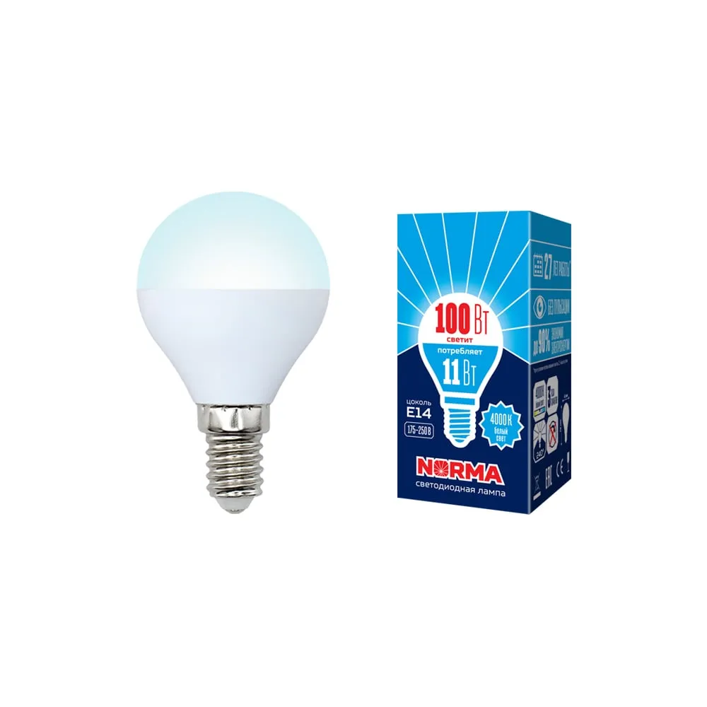 Цены на похожие товары Volpe, 4000 K, 900 Лм, 80 Ra, 11 Вт, G, 220 В, e14, шар