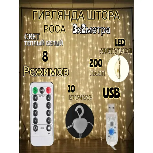 Светодиодная LED гирлянда штора 3х2 (200 ламп LED) занавес с пультом (ДУ)управления цвет теплый белый