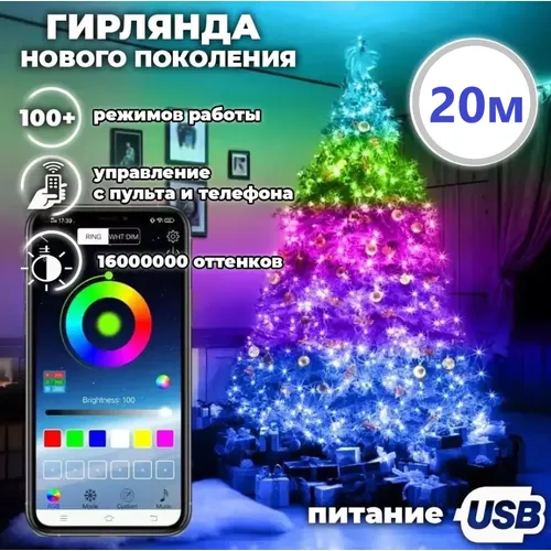 Умная светодиодная гирлянда роса для дома и улицы 20 метров/200 ламп. Управление с телефона + с пульта ДУ. Влагозащищеная IP65. Питание от USB.