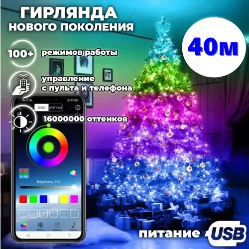 Умная светодиодная гирлянда роса для дома и улицы 40 метров/400 ламп. Управление с телефона + с пульта ДУ. Влагозащищеная IP65. Питание от USB.