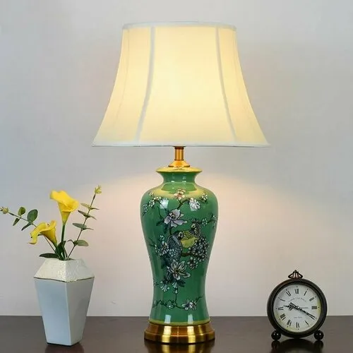Зеленая керамическая настольная лампа с цветами и птицами 70Х40 см