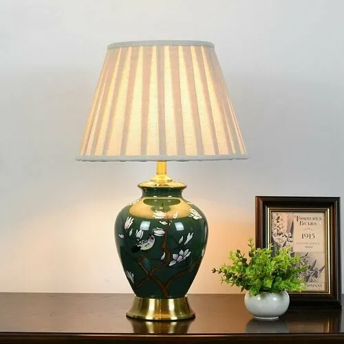 Зеленая керамическая настольная лампа с цветами и птицами 52Х33 см