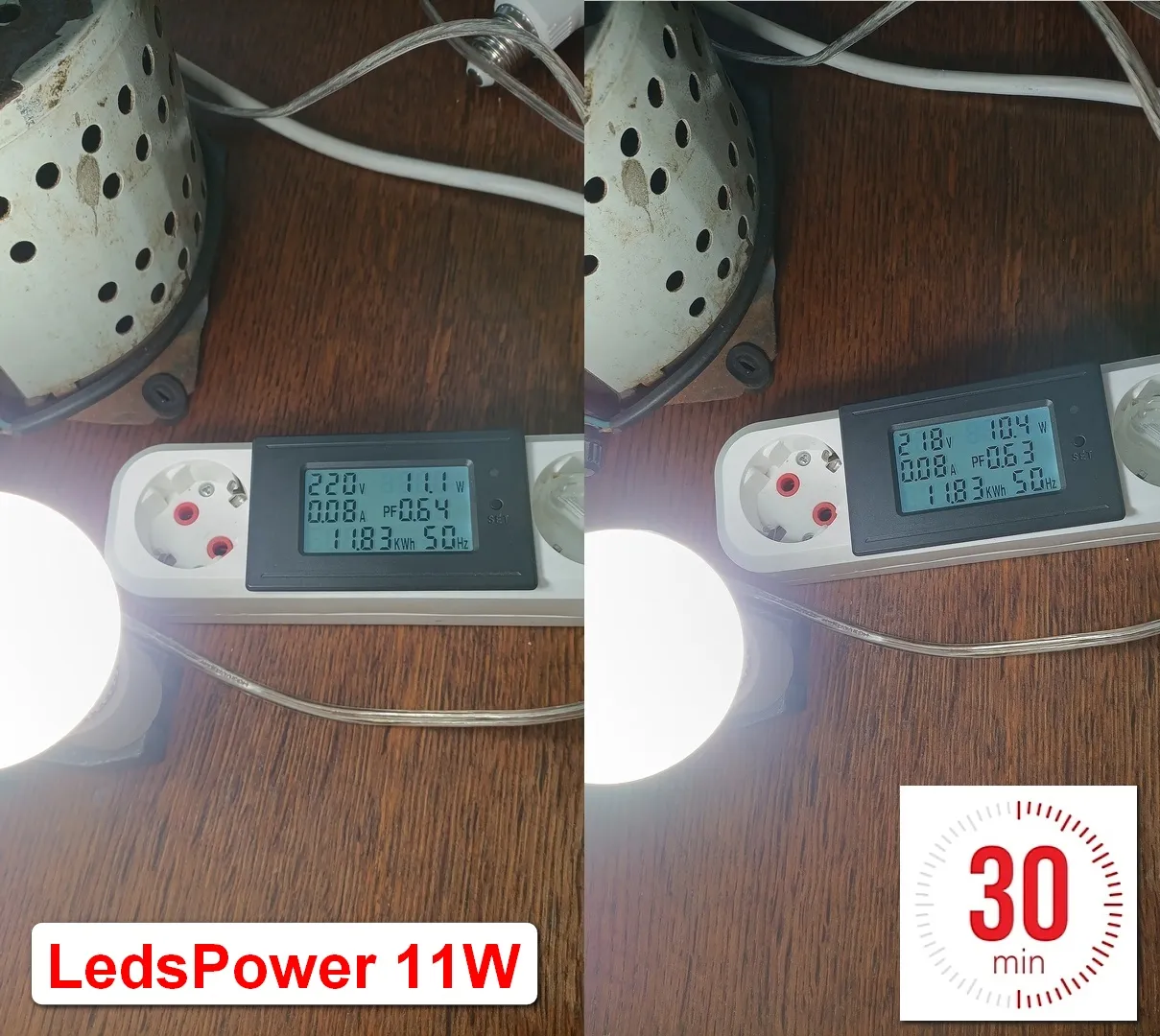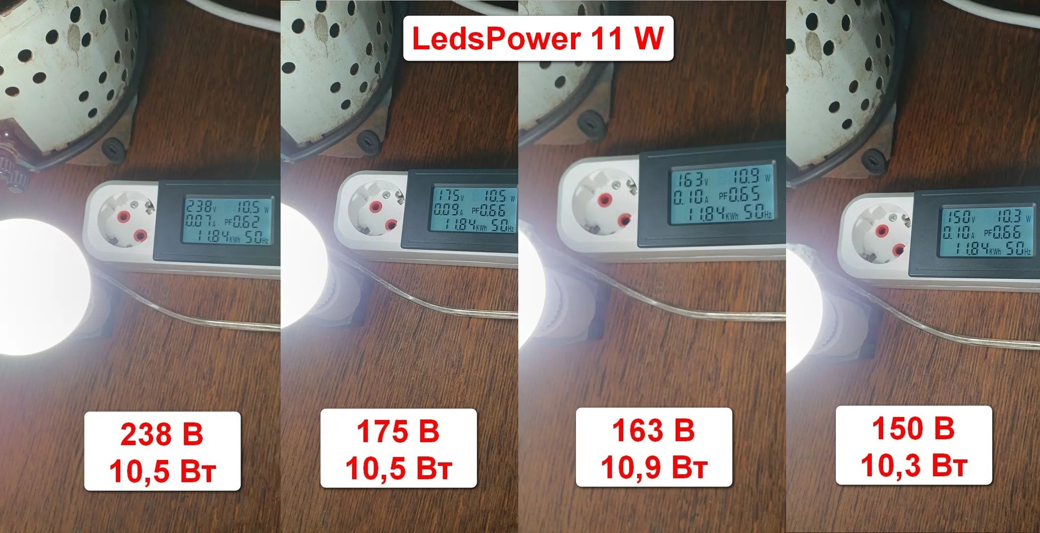 LedsPower нам обещает 11 Вт . При включении 11,1 Вт ! Фантастика ! После прогрева лампы 10,4 Вт . Мы видим разницу 0,7 Вт против 0,4 Вт у Osram . Для того чтобы правильно оценить это значение конечно нужно смотреть разницу мощности на светодиодах. Для этого нужно вскрыть лампу и сделать измерения.