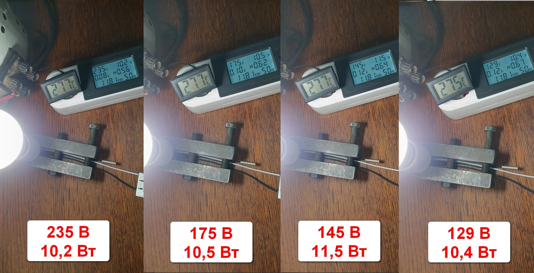 Эх... как же приятно видеть, когда при снижении напряжения питания, мощность остается неизменной... Импульсный драйвер, как-никак)))