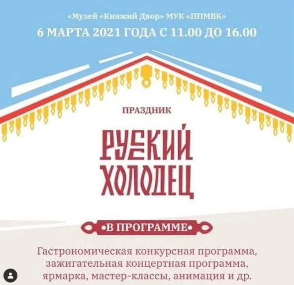 Мероприятие состоится в Павловском посаде, которое, прежде всего, является конкурсом на лучшее приготовление холодца. Они будут разной формы и вида, а потому посетители смогут увидеть холодец, похожий на гитару, футбольное поле, поселок с домиками, сказочный домик и павловопосадский платок. Даже состав холодца будет не только будет не только из свинины, но и баранины, говядины и курицы, а еще из фруктов и рыбных продуктов. Программа обещает быть разнообразной, а потому предусмотрены концерты, танцы и песни, а также анимационные шоу. Будет работать выставка изделий декоративно-прикладного и народного творчества. Фестиваль начнется в 11 утра и закончится в 16 часов. Место проведения: музей «Княжий двор» (городской округ Павловский Посад, поселок Большие Дворы, улица Маяковского, дом 130).