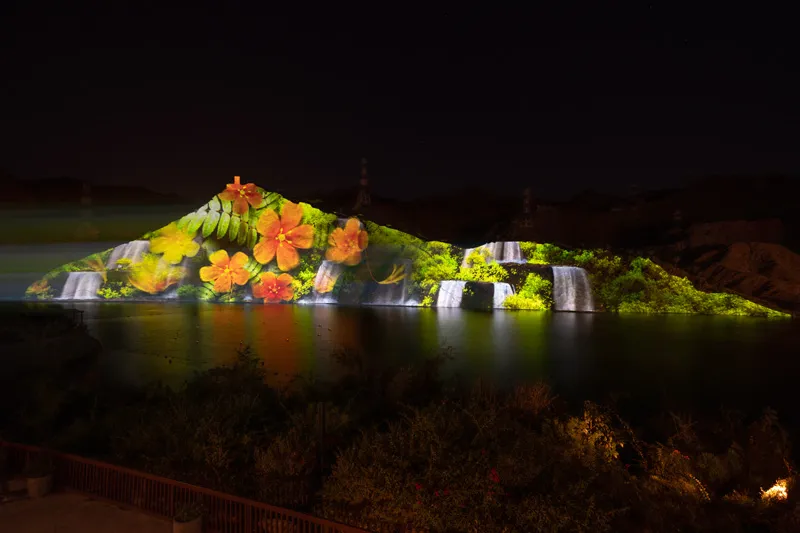 Впервые в рамках созданного компанией Artabesk проекта The Jewel of Al Rafisah Dam удалось отобразить визуальный контент на такой огромной горе. Поскольку сложность в реализации заключалась в многочисленных тенях и свойственному этой горе коричневому цвету, было решено применить приборы ведущий в своем классе 3-чиповый DLP-проектор TITAN Laser 37000 WU, который имеет яркость 37000 люмен (WUXGA)/31000 (4K-UHD). Такие свойства идеально подходят для больших уличных объектов. Проблему с тенями решили за счет концентрации всех 16 проекторов TITAN Laser 37000 WU на одной точке горы. Благодаря этому зрители могли видеть очень четкое изображение.