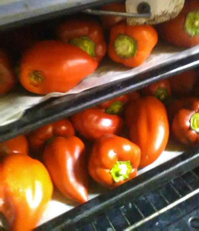 Перец моем и запекаем в духовке до момента, как кожица начинает отделяться