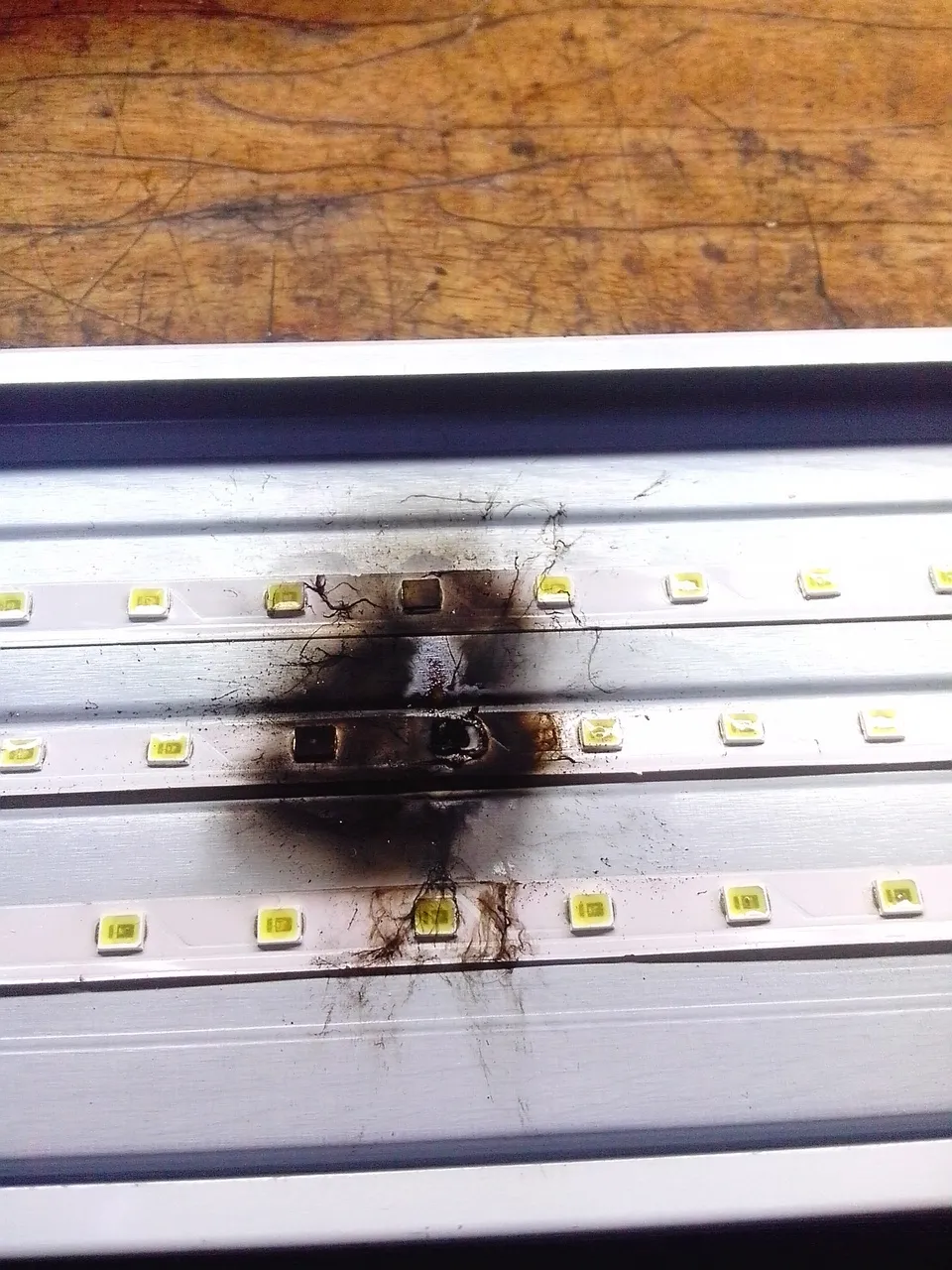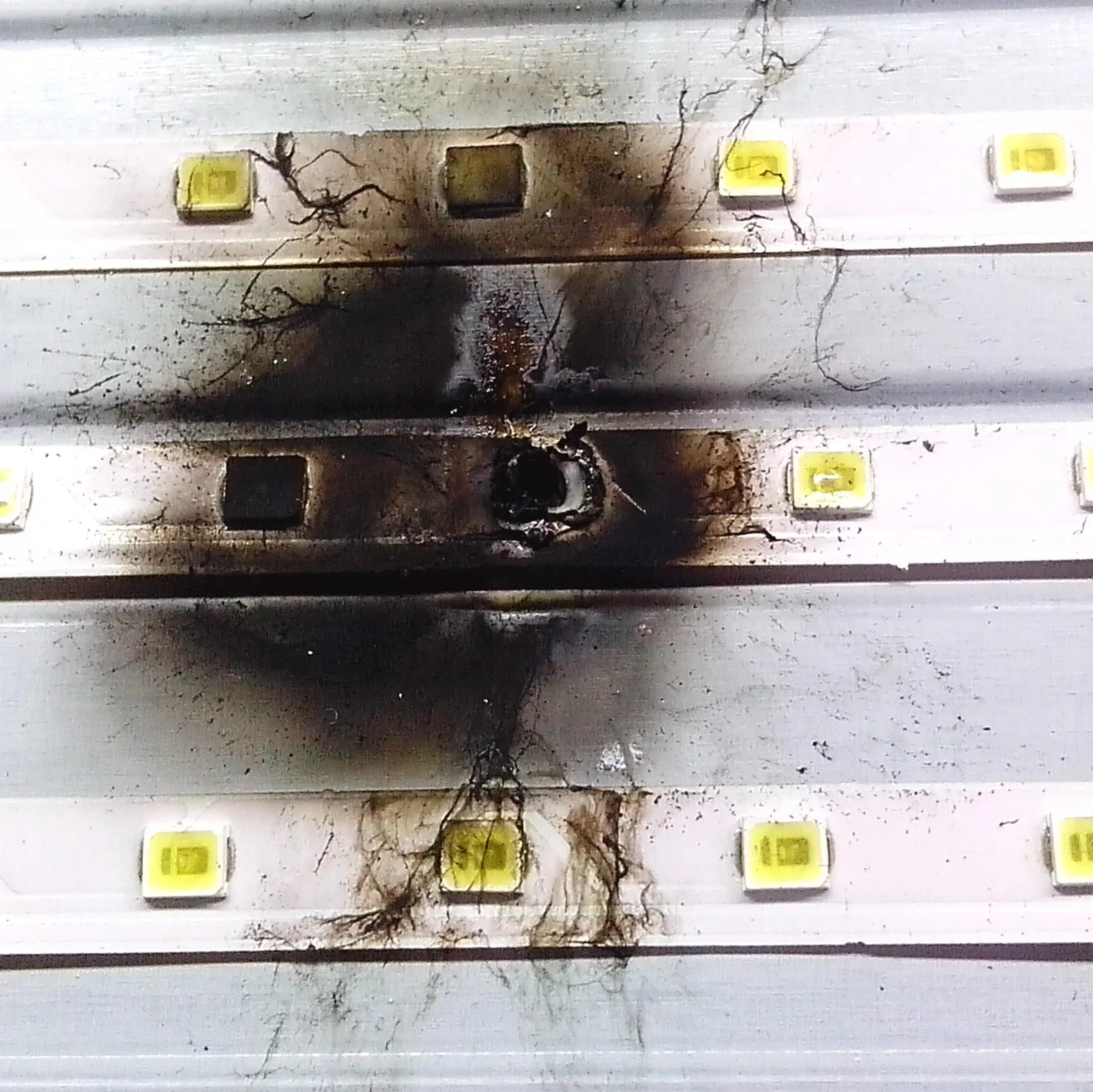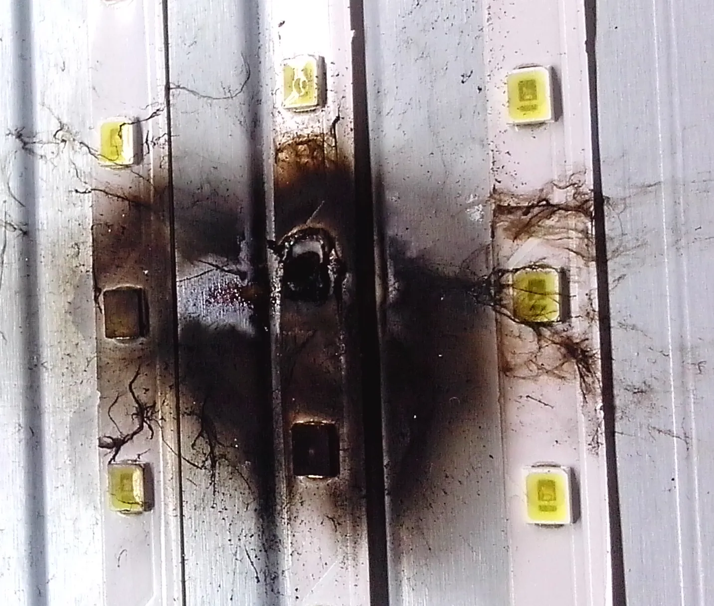 Один из вариантов такой . Т.к."светодиоды не приклеены нормально к металлическому корпусу" лента нагрелась, изогнулась и один корпус светодиода оказался висеть над радиатором. Он то без радиатора и перегрелся и сгорел первый .