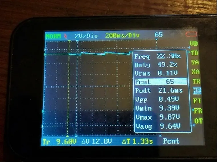 Преобразователь поддерживает чуть больше 9 Вольт и на холостом ходу и под нагрузкой . А вот пульсации вроде меньше , чем на скриншоте .
