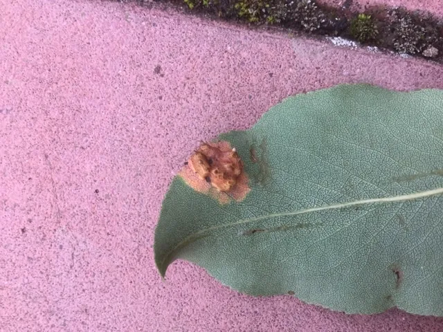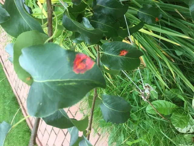 Я уже неоднократно писала и показывала молодые деревья груши, которые атакует такая напасть как ржавчина. Меня очень волнует вопрос здоровья сада. К сожалению, деревья сейчас подвергается таким атакам всяческих болезней, что если ничего не предпринимать, то в конце концов мы останемся только с дикорастущей их частью. Так вот и с грушей. Она еще не дала ни одного плода, на мой взгляд это как то очень долго, ей уже 5 лет, а даже намека на плоды нет. Но это другая история. Теперь о ржавчине, на листьях появляются рыжие пятна, если опыта нет, то можно и проигнорировать их, пройдет. Нет, ничего не проходит. В этом году удалось остановить болезнь, опрыскала вовремя. Конечно отрезать все поражённые листочки не реально. Вот теперь давайте посмотрим что же такое ржавчина. Вот листочек с наружней части.