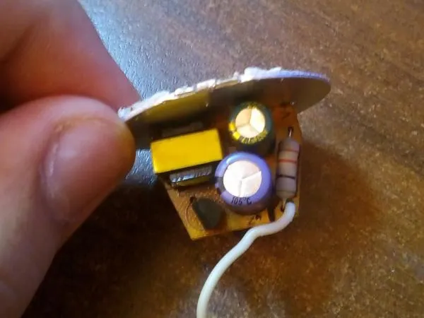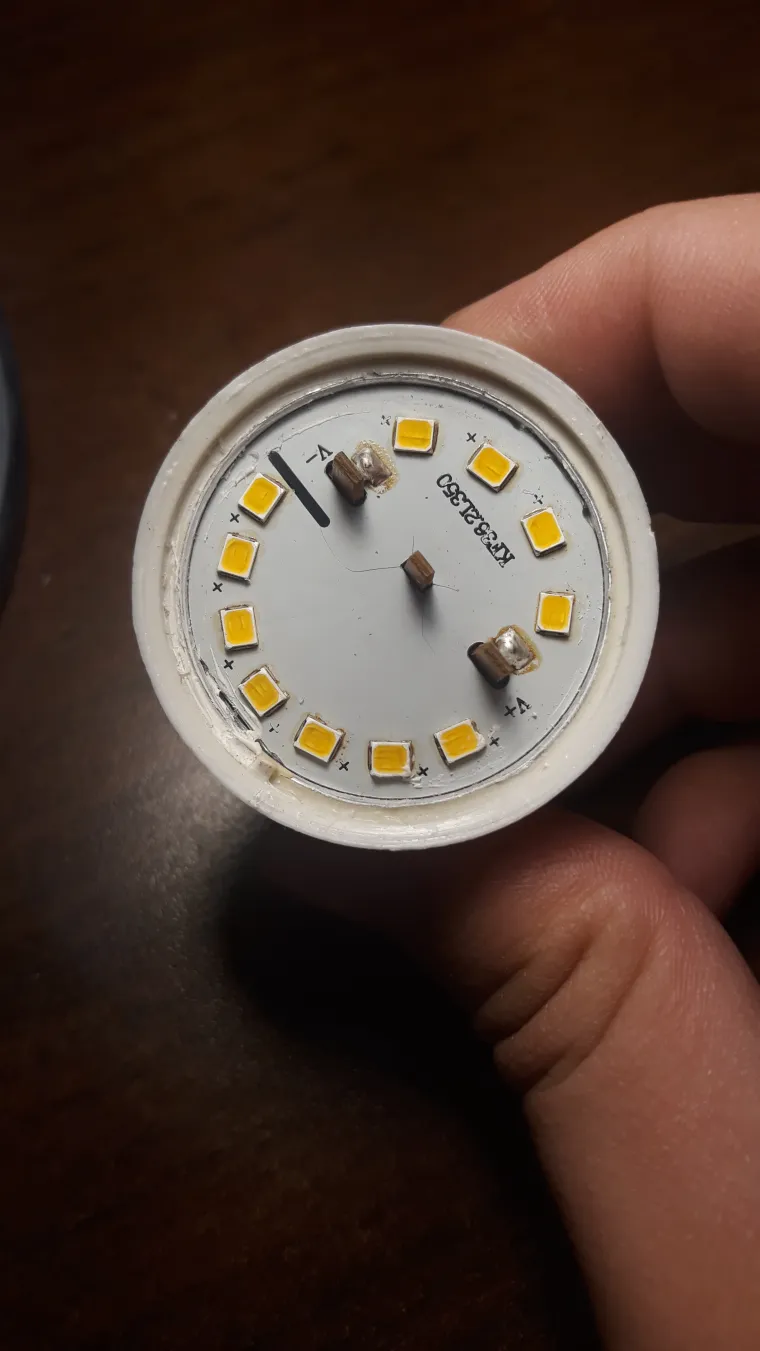 В лампе располагается 11 светодиодов и что то это подозрительно, явно обманули с мощностью. На деле это 6-6.5w лампа получается. Но световой поток который заявил производитель она впринципе выдает. И это потому что светодиоды работают в запредельном режиме, они грелись так сильно что аж потрескались и даже от нагрева потрескалась сама алюминиевая плата !!! Причина этого - плохой радиатор, такой же установлен в 5w лампе и уж явно больше 5 w этим куском фольги не охладить. Зато в отличии от 5w в лампе используется импульсный блок питания.