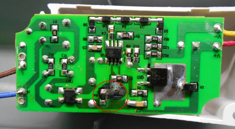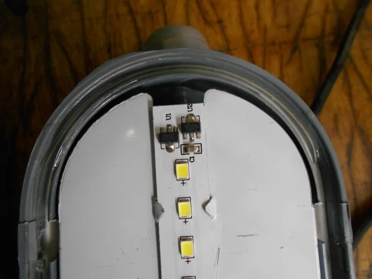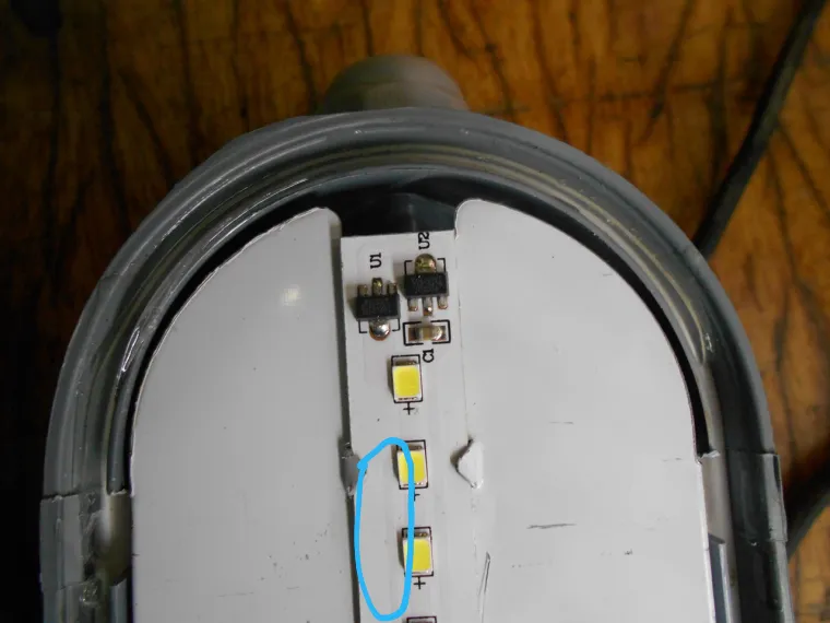 А сколько же светильник все-таки прослужил? Интересно, что "разработчик" не стал изобретать параллельную работу светодиодов, а использовал одну цепочку низковольтных светодиодов... Но драйвер, увы...