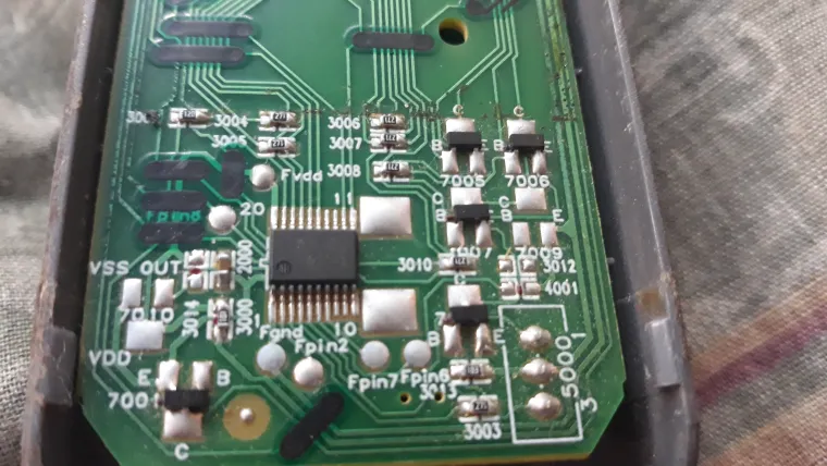 Ещё один интересный момент заключается в том, что если щупами мультиметра замкнуть чёрные дорожки около контактной площадки и вести щупы по ним на площадку, то кнопка работает. Если же сразу замкнуть в том же месте на контактной площадке, то кнопка не срабатывает. Похоже, что для первоначального запуска требуется более низкое сопротивление, а когда уже пульт начал работать, то для продолжения работы хватает большего сопротивления.