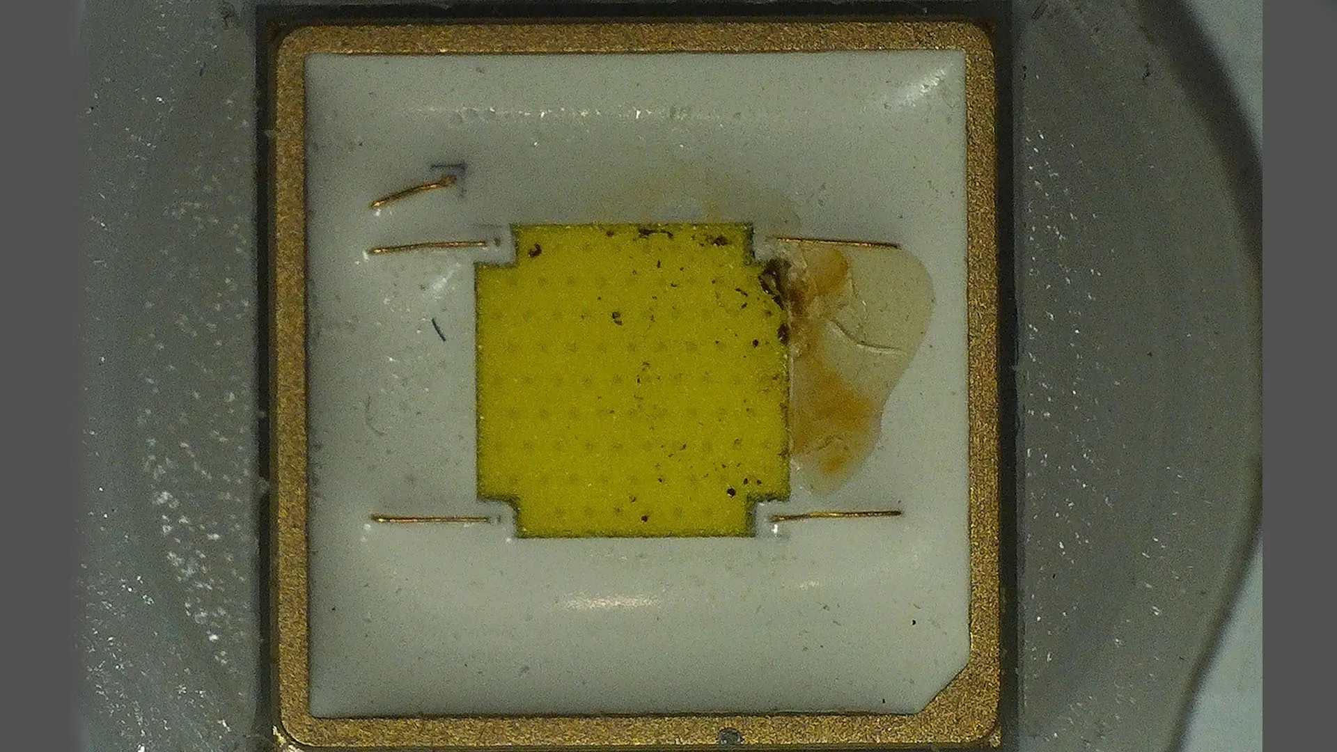 Слегка подгоревший luminus SFT40 также состоит из мелких светодиодов. Некоторые похоже выгорели, однако кристалл сохраняет свою работоспособность.