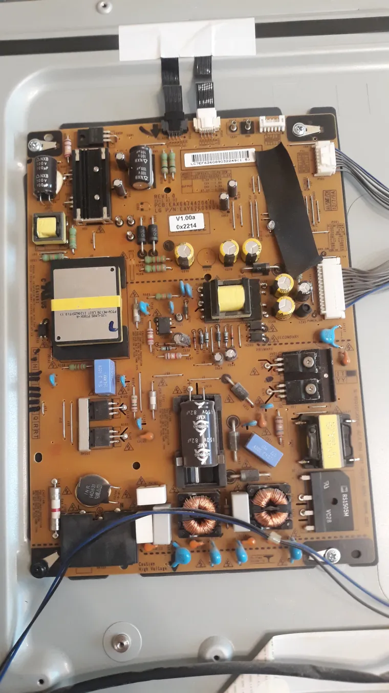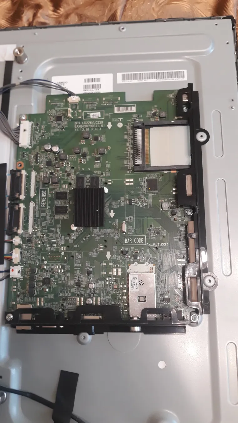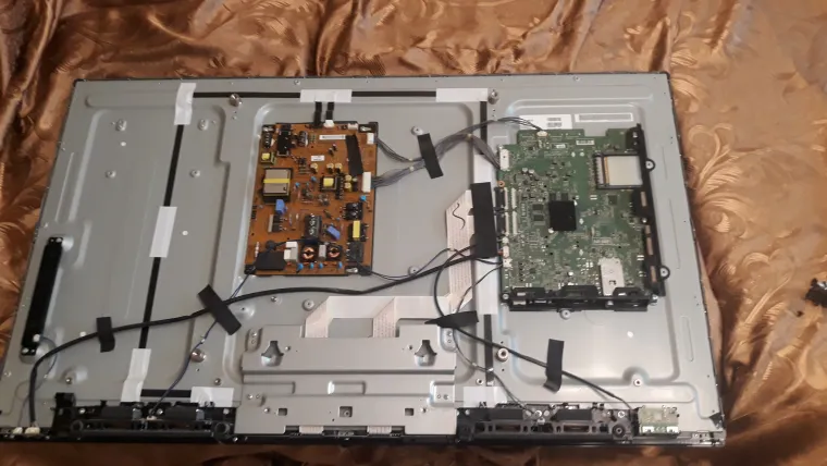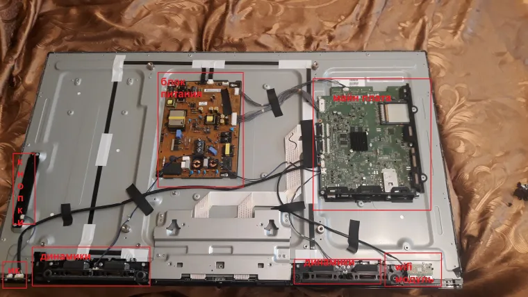 Майн плата - основная плата в этом телевизоре, она представляет собой целый компьютер, все функции телевизора обрабатывает именно она, она формирует картинку, идущую уже в виде сигналов по шлейфам на жк панель телевизора.