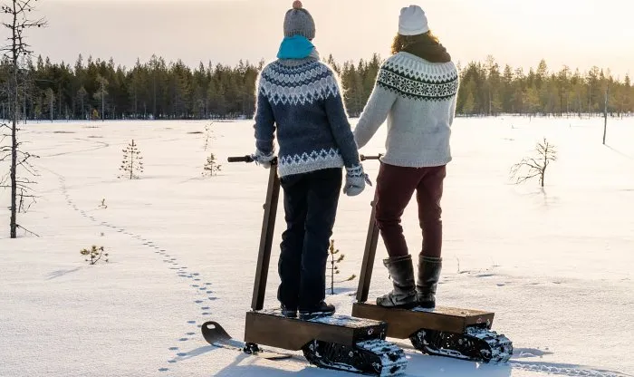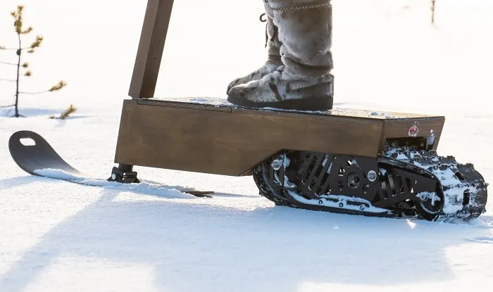 Необычный электросамокат из дерева в ретро стиле собрал финский изобретатель Паси Кауппинен. Он предназначен для катаний по снегу. Устройство под названием eLyly можно назвать и скутером, и снегоходом, и самокатом в компактной сборке. Также конструкция максимально приближена к финским лыжам. Передвигается он за счет электродвигателя на 100 Вт со скоростью до 25 км/ч.