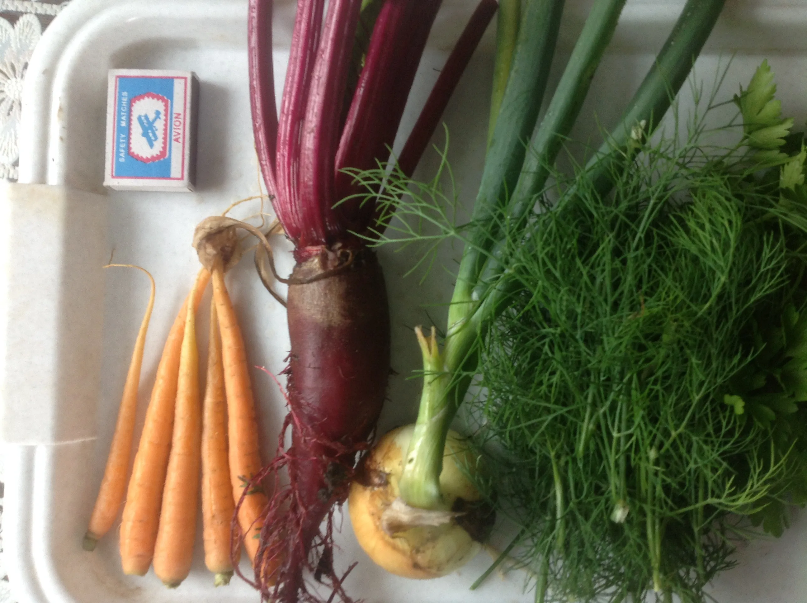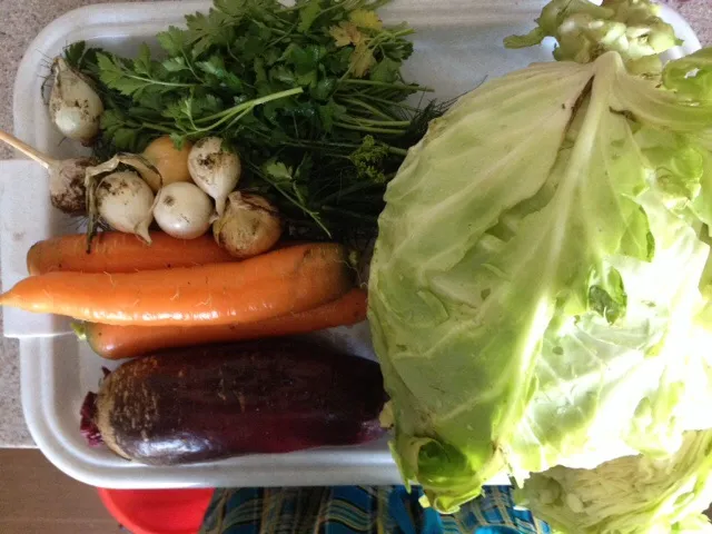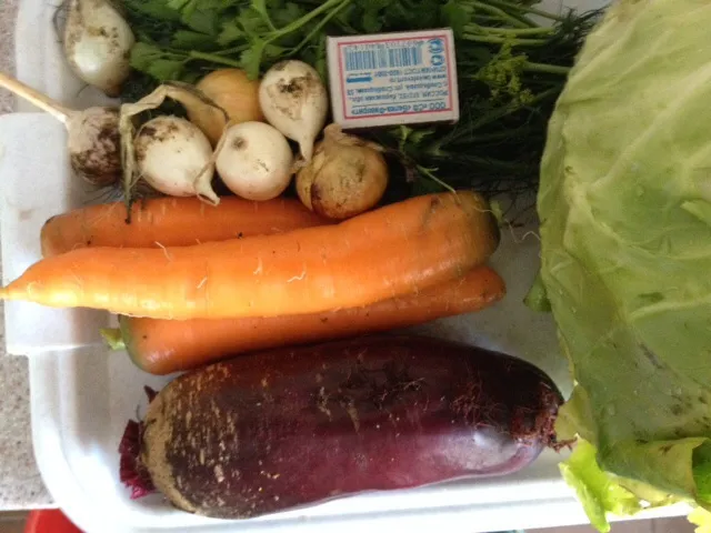 В выходные решила порадовать своего сына горячим блюдом, сварила борщ. Все ингралиенты для него взяла на грядках. Капуста лопнула и я ее решила в земле больше не держать. А вот моковь и свекла еще постдят. Для сравнения выкладываю свой борщевой набор в июле.