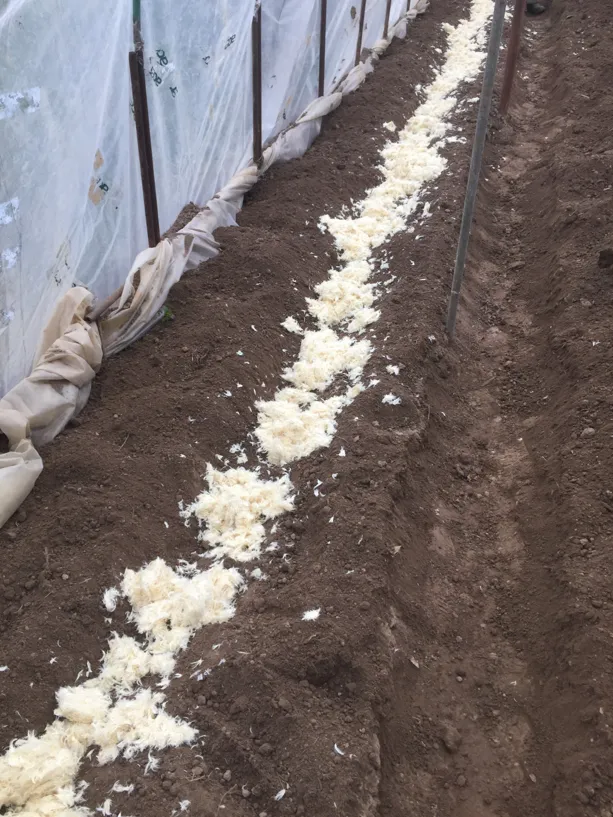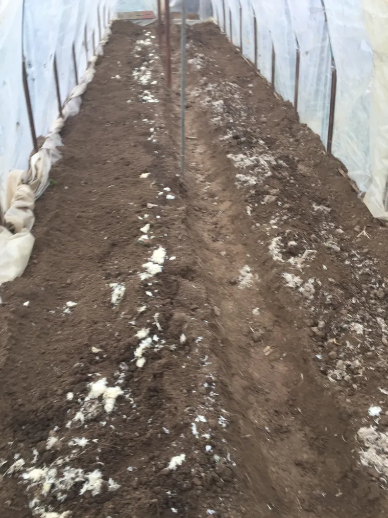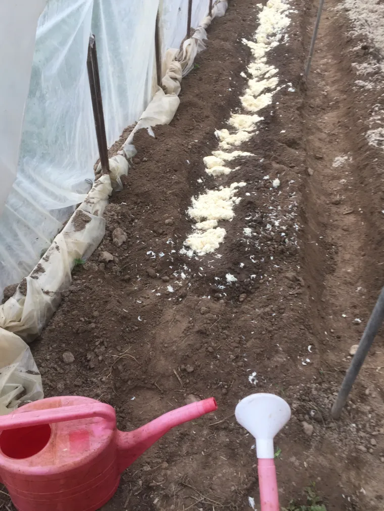 Теперь закапываем. Полностью закопать перья не удалось, но это теплица, а поэтому они никуда не разлетятся.