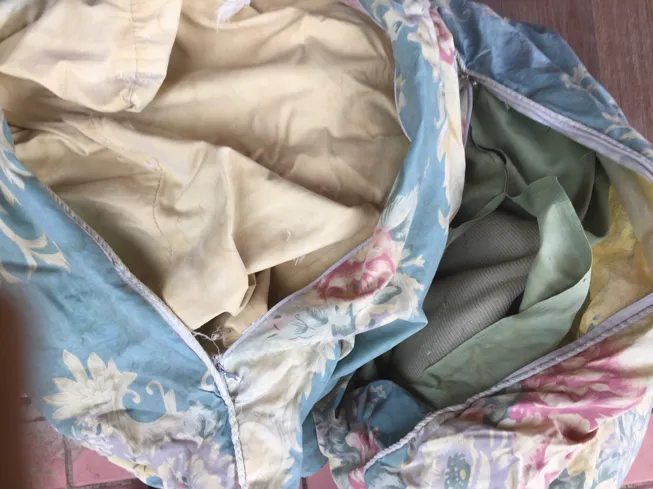 В одной подушке были белые перья, а в другой серые, причем то ли пришитые, то ли приклеенные к полоскам материала