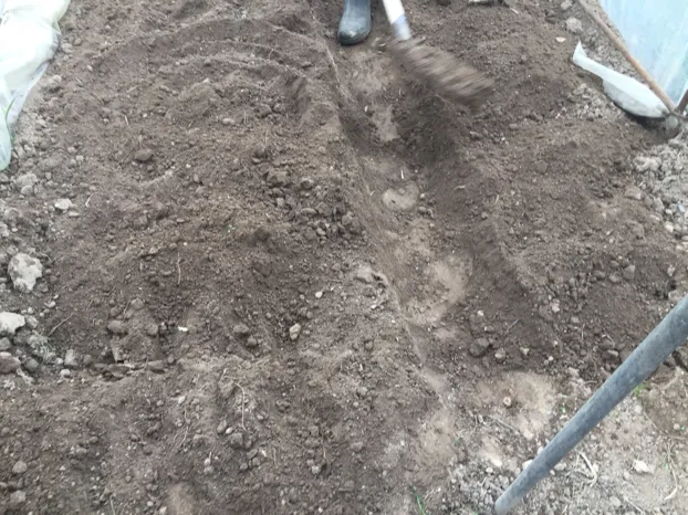 Закапывать перья решили в теплице. Вскопали землю, сделали грядки.