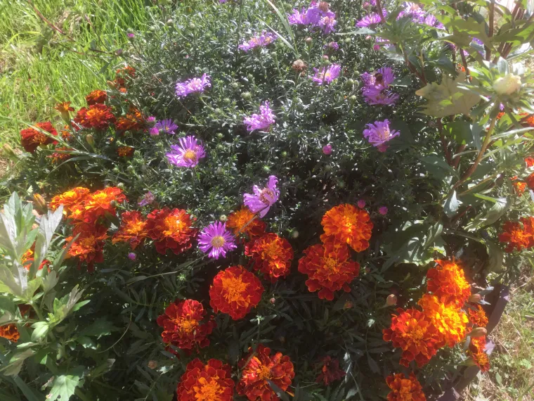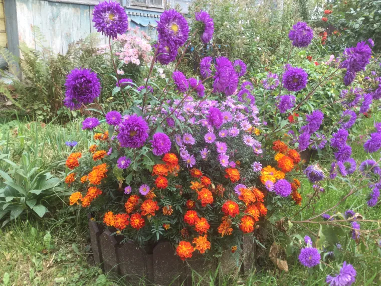 Очень порадовала в этом сезоне хризантема мультифлора. Я же ее только осенью посадила на клумбочку, никак не ожидала, что она сможет зацвести этим летом, поэтому по краю посадила бархатцы. Оказалось очень удачно. Бархатцы сами по себе хороши, а еще и подчёркивают высоту и красоту хризантемы. На фото это не удалось поймать, в живую все значительно лучше.
