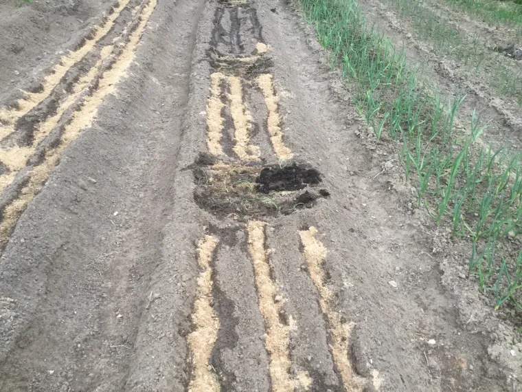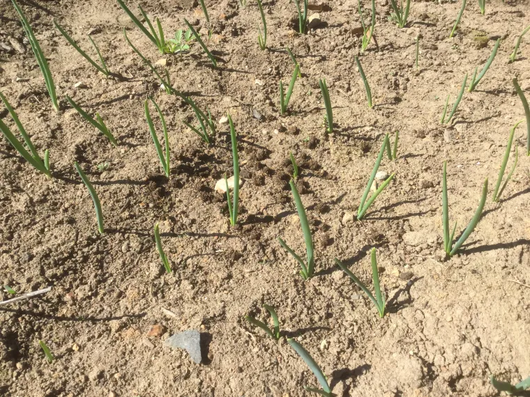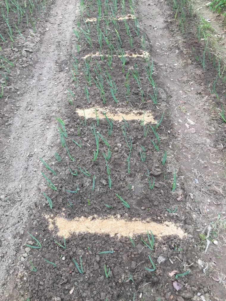 Это тот лучок, который взошел. В этом году очень ровненький, почти без пропусков. Посмотрим, что будет дальше.