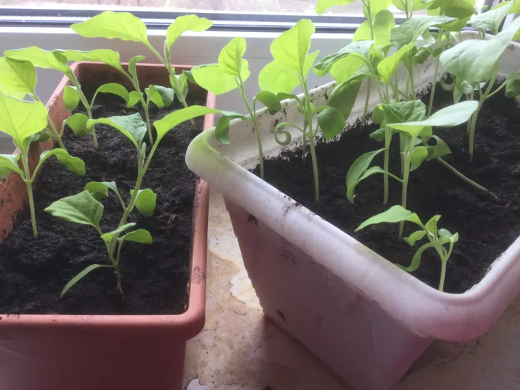 Эта неделя была очень необычной, во всяком случае не на моей памяти. На улице очень жарко, в доме включено отопление. Прогноз погоды показывает похолодание на 10 градусов, до 13-15 градусов, а в доме без отопления при такой температуре холодно. Пришлось уменьшить температуру, но все-равно в доме была жуткая жара, открывали окна, но это от перегрева не сильно спасало. Что говорить о растениях. Им постоянно нужна была вода. Рассада за это время довольно сильно подросла, потребовалось пересадка. Самые большие на моих подоконниках - баклажаны.