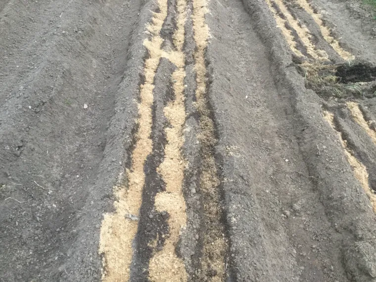 Теперь в середине грядки прокопали канаву и сложили туда перья