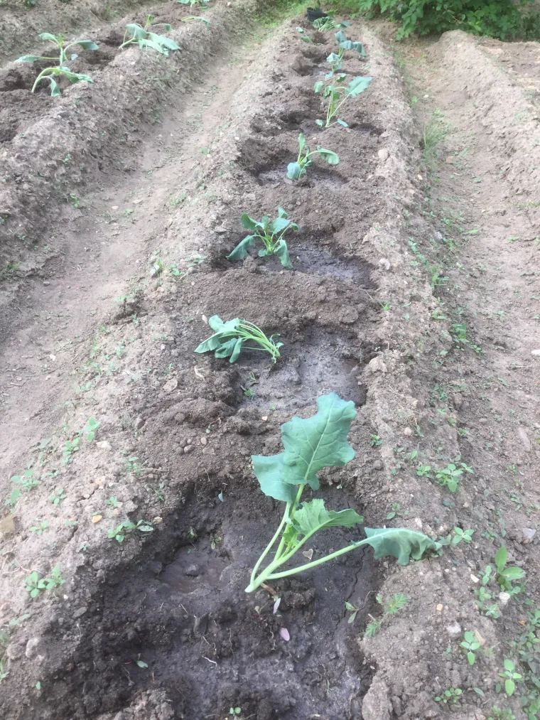 В теплице отлично подросла рассада капусты и пришло время ее пересадить на грядку. В каждую лунку добавила немного золы, конского навоза и залила большим количеством воды. Фото капусты сразу после пересадки не вдохновляет. Очень надеюсь, что большое количество воды приведут капусту в норму.