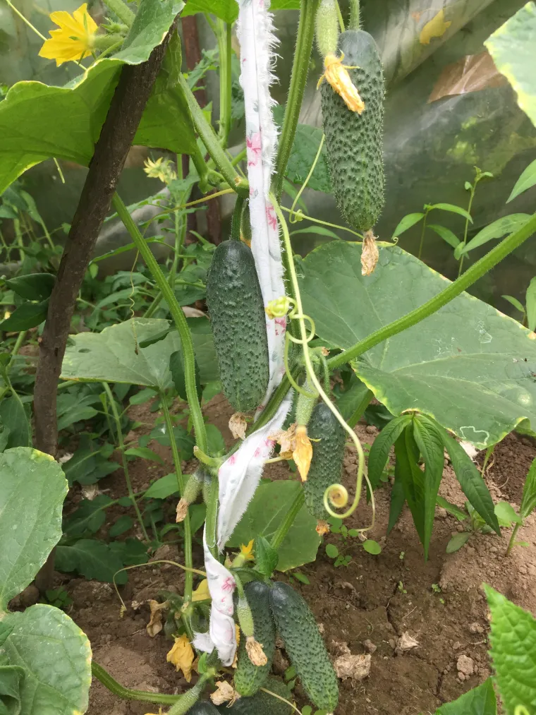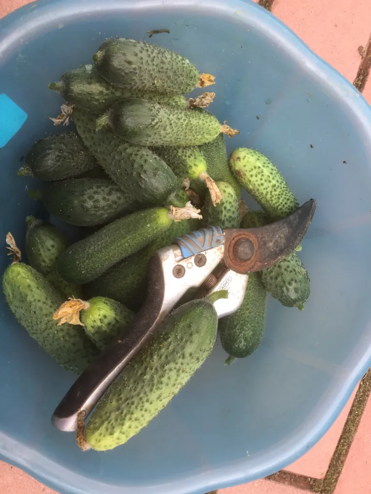 Еще раз вернусь в теплицу. Сначала огурцы. Надо отметить, что «кировские семена» оказались очень урожайными сортами. У меня всего 5 растений, а урожай я снимаю приличный. В субботу сняла большие и толстые, а вот в воскресенье уже маленькие, на засолку.