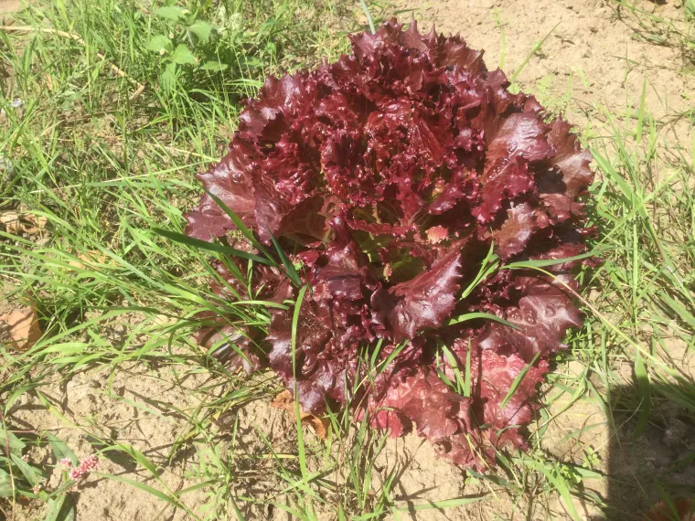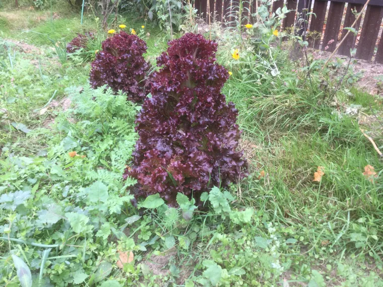А вот еще красивое растение на грядке - салат. Этот хорош тем, что за целое лето ни один куст не ушел в цвет. Вкуса у него нет, может только горчинки добавляет, но красив необычайно. На праздничном столе смотрится очень выигрышно.