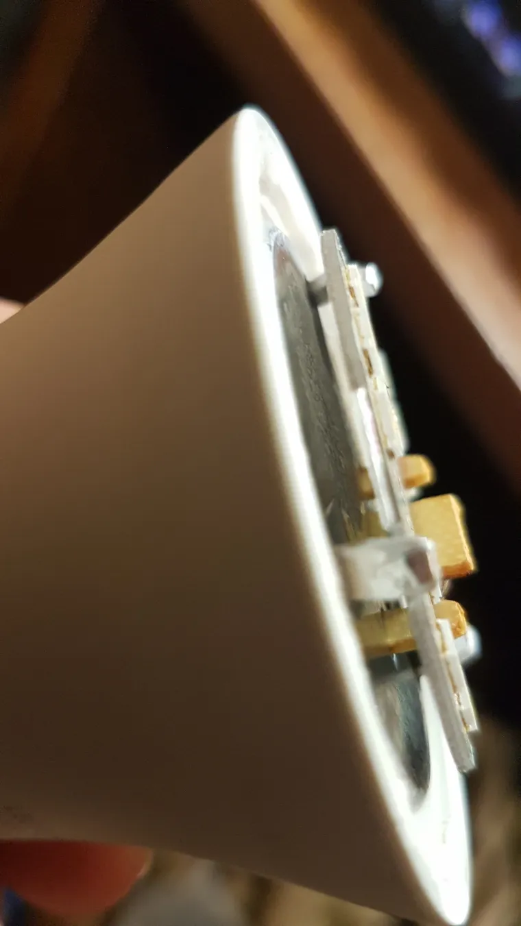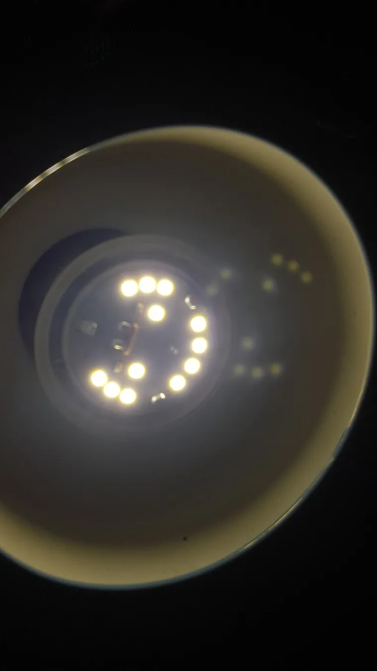 В лампочке 13 светодиодов. Это же 13 ваттная лампочка! Обман от Camelion, он отвратителен... для приличия бы хотя бы 14W указывали. Один из них сгорел, он с черной точкой. Давайте приподнимем плату и посмотрим, есть ли под светодиодной платой термопаста...