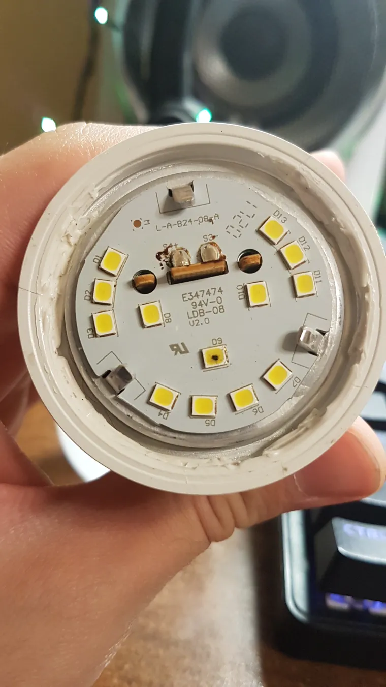 Скажем спасибо, что паста вообще есть. Я уже хотел было разломать всю лампочку, чтобы посмотреть какой у неё драйвер и отправить её на утилизацию в мусорное ведро, но тут меня посетила одна отличная идея. Провести ремонт лампочки! Давайте вспомним, как в тысяче и одном видео на ютубе чинят эти лампочки? Закорачивают светодиод и дальше пускают в работу! Мне идея понравилась, аккуратно меняю термопасту под платой, обратно загибаю плату. Выкусываю светодиод, запаиваю перемычку на месте плохого светодиода, готово:
