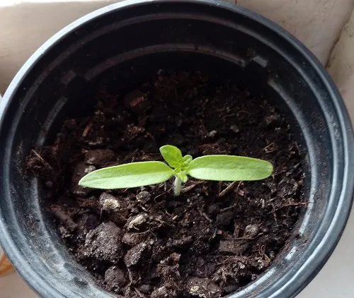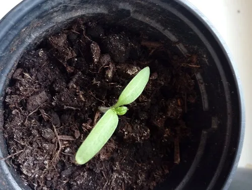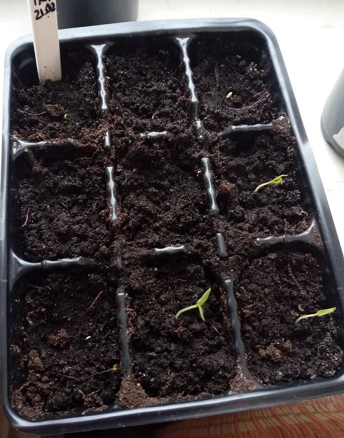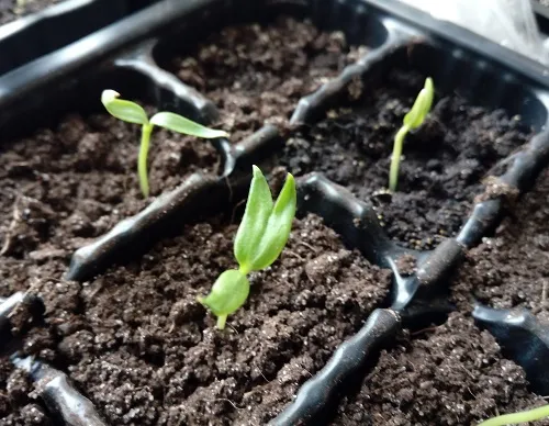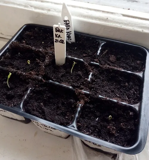 В этом году все всходы без семенной оболочки. Это произошло потому, что когда я сажаю семечко и присыпаю его землей, сверху обязательно прихлопываю землю, уплотняя ее в месте посадки семечка. Более плотный грунт сверху является более серьезным препятствием для прорастания, но это и хорошо. Взойдут только сильные, качественные семена. И взойдут они , оставив семенную оболочку в земле.