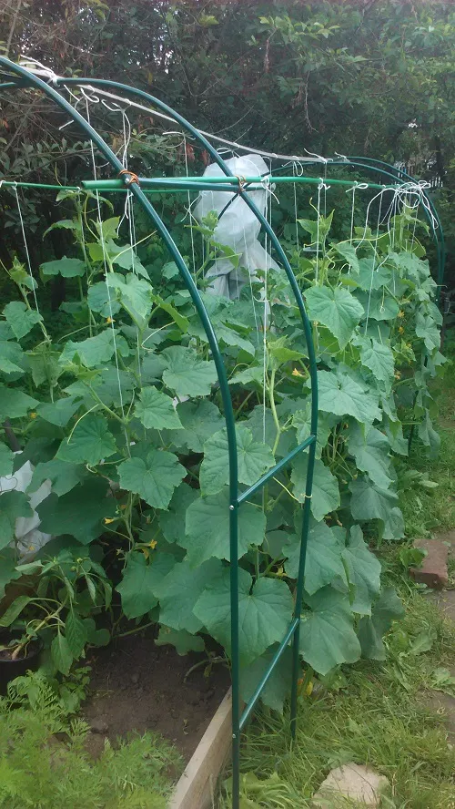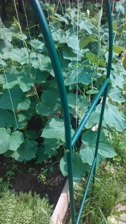 Огурцы. Честно говоря, не помню,чтобы бу моих огурцов былтакой мощныйлистовой аппарат. Вот наше приспособление для огурцов