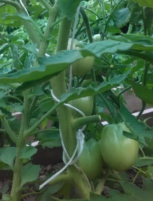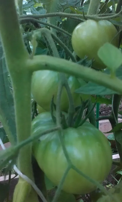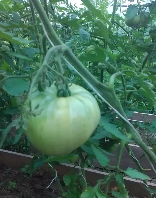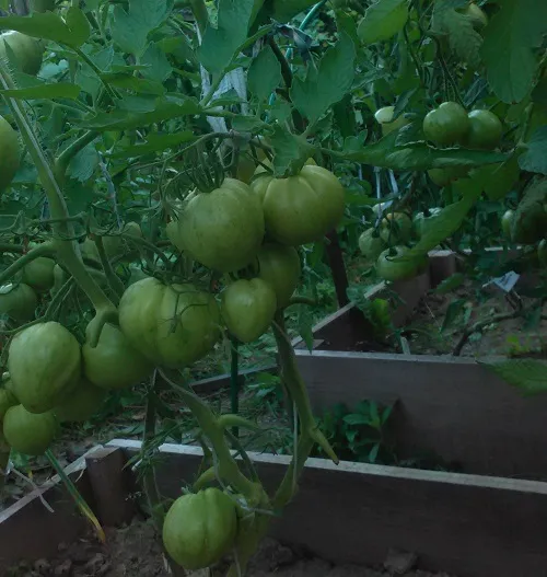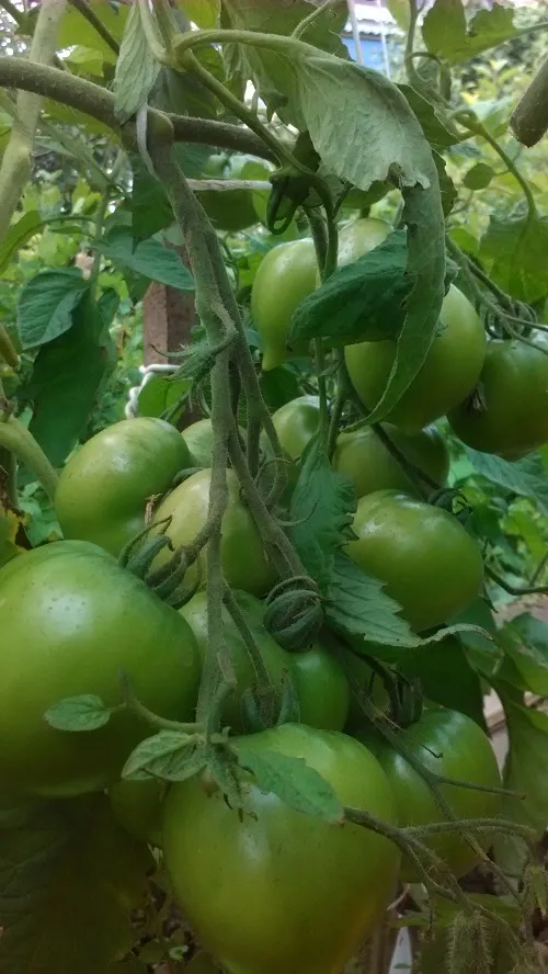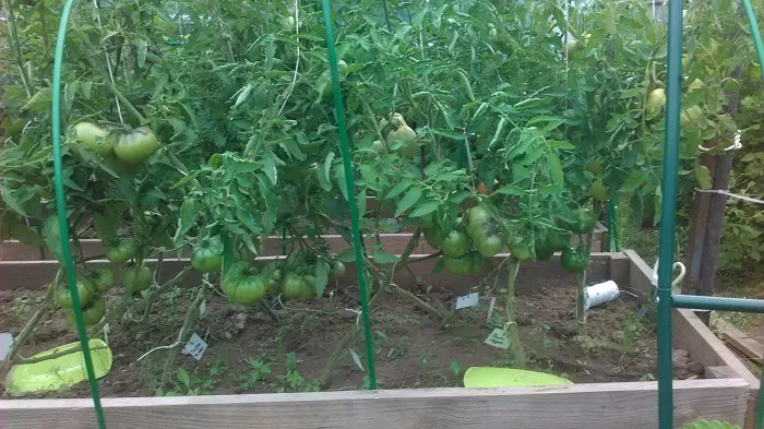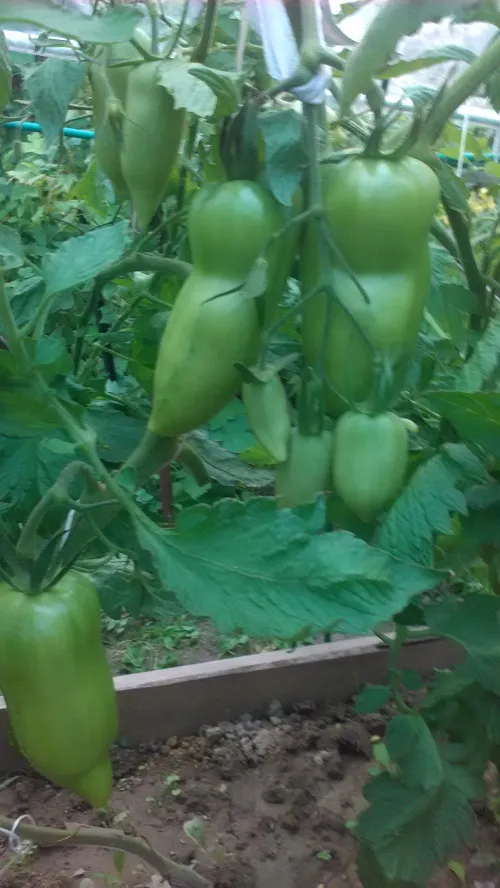 Помидоры. Сегодня 30 дней со дня, как они начали завязываться. Считается, что помидор зреет от 30 до 60 дней. Ну, осталось подождать еще 30 дней. Никто и не думает краснеть.