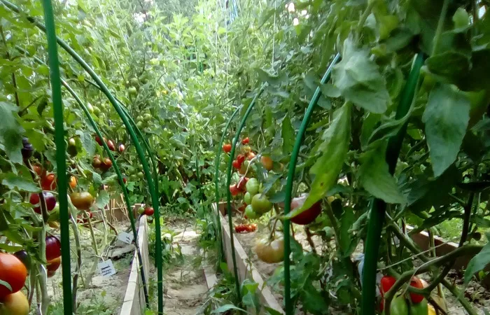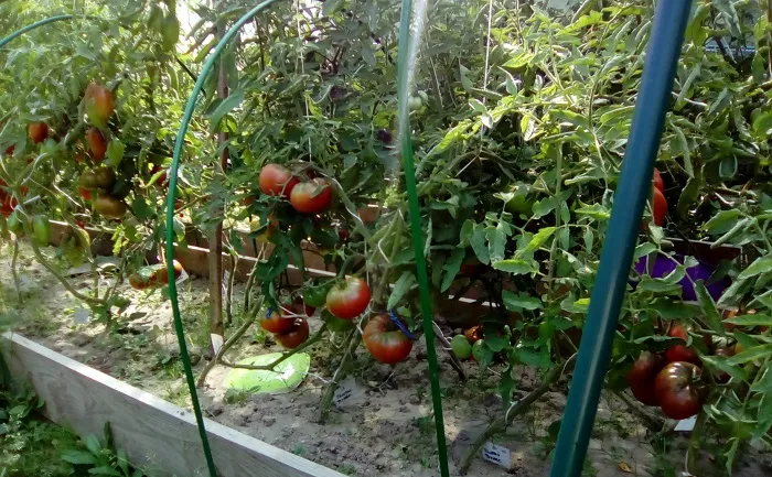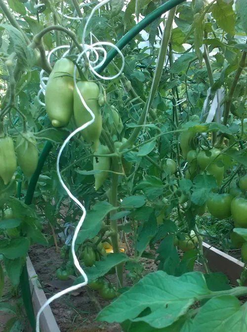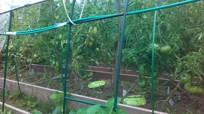 Перетянули мы пленку над укрытием. Ветер потрепал пленку как надо. В общем, конструкция наша довольно хлипкая, так как все кусты к не подвязаны, томаты набирают вес, каркас трещит по швам.