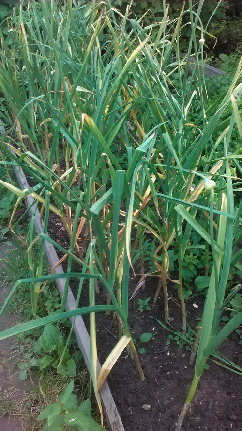 Чеснок. Чеснок вырос средний. Была очень и очень высокая зеленая надземная часть. Пер чеснок не по детски. Но под землей, как оказалось, все было не так радужно. Плюс к тому, на зеленой части летом были обнаружены какие-то белые червяки. Не смогла я найти нигде, что это за дрянь, которую пришлось удалять.