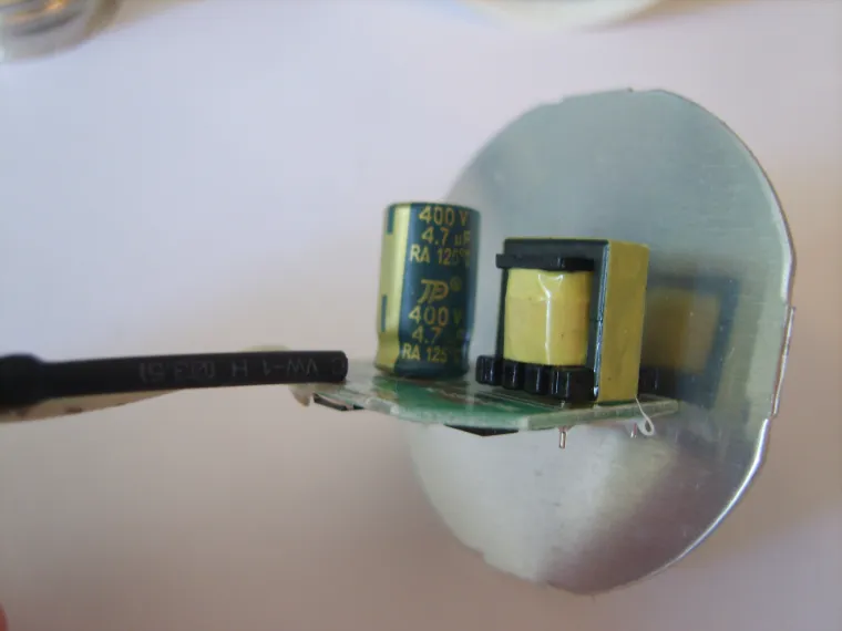 В лампе используются светодиоды с номинальным прямым падением напряжения – 6 Вольт, а также прямым током до 150мА. То есть мощность каждого диода не более 1 Ватта. На плате импульсного стабилизатора тока не распаяно достаточно много компонентов. Самым важным из них является конденсатор на выходе импульсного драйвера, который должен сглаживать высокочастотные пульсации тока через светодиоды.