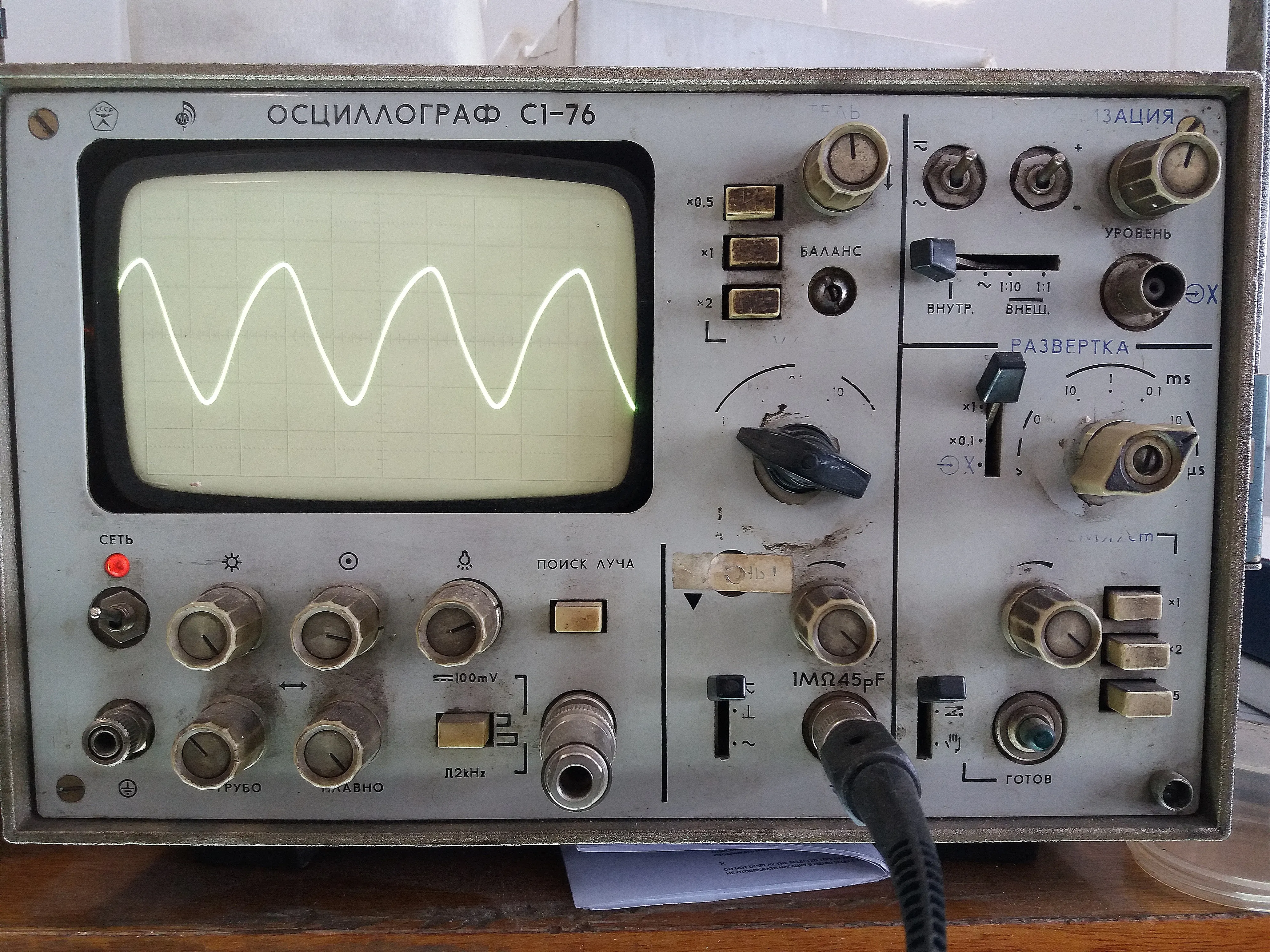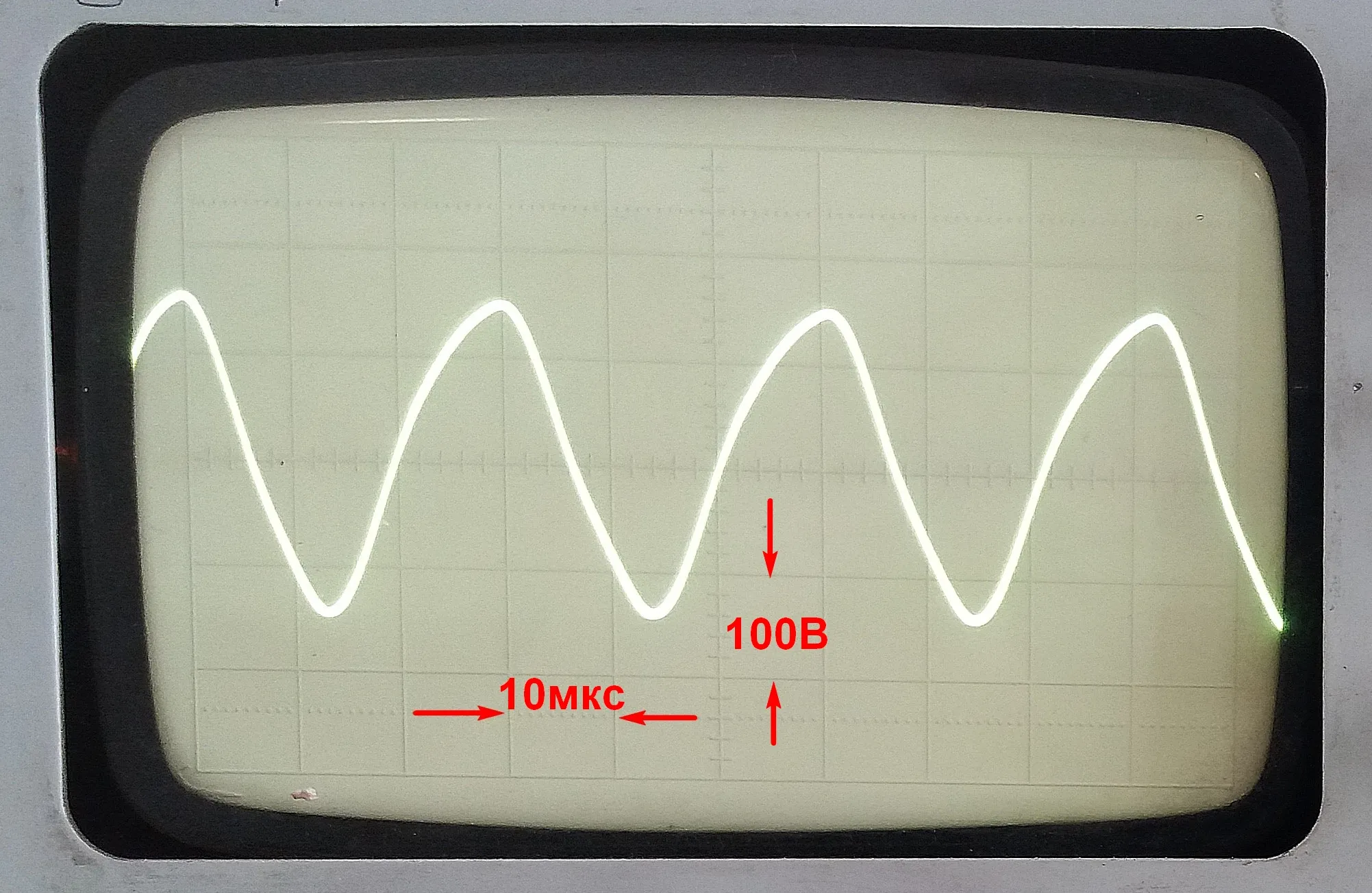 По осциллографу - период 30 мкС = 33 кГц. Размах примерно 300 Вольт, то есть амплитуда примерно 150 Вольт. А действующее значение напряжения = 150/1.41 = 106 Вольт.