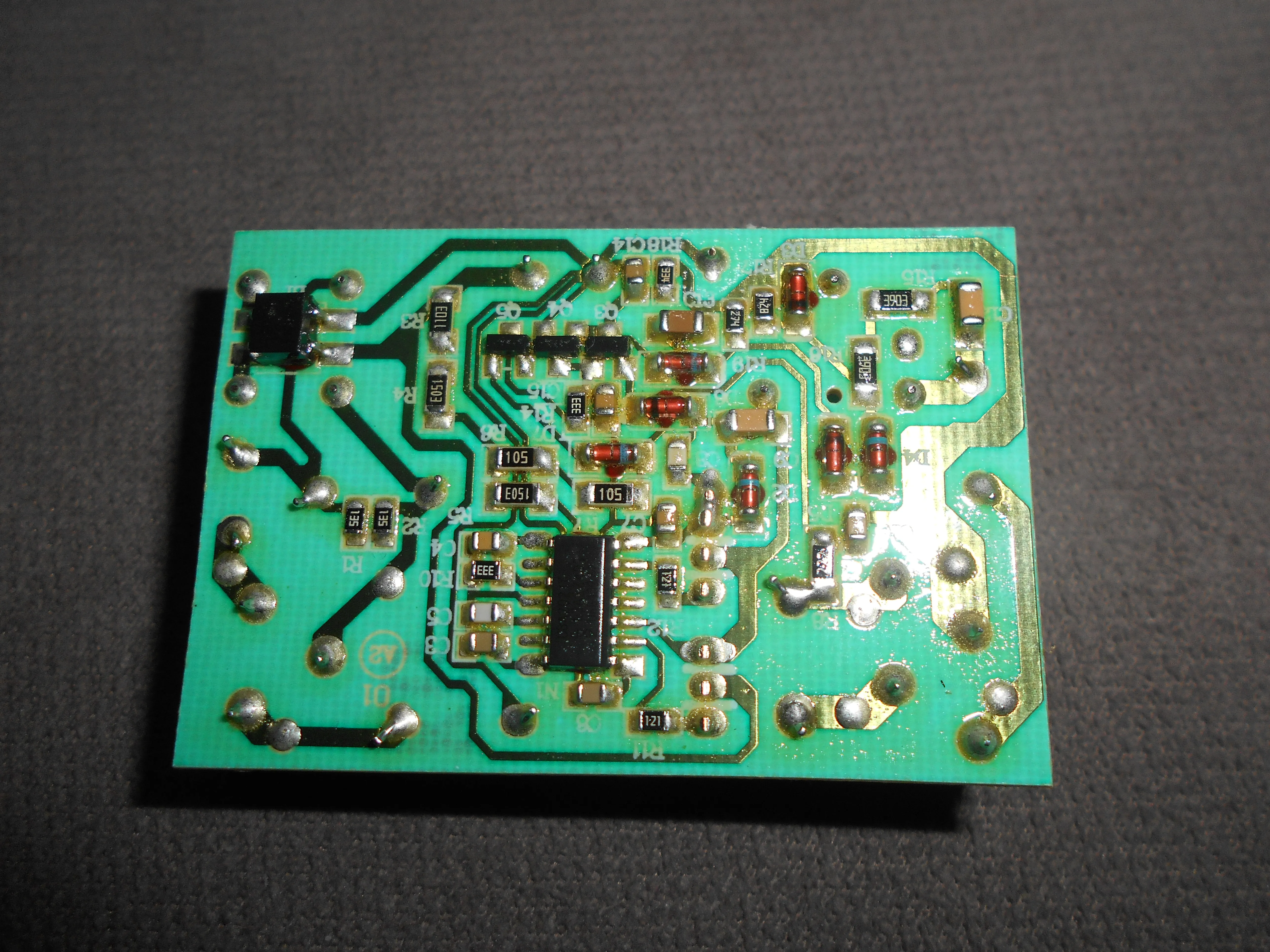 С обратной стороны платы мы видим специализированную микросхему для ЛЛ. Печатные проводники покрыты лаком. Плата ЭПРА изготовлена из стеклотекстолита.