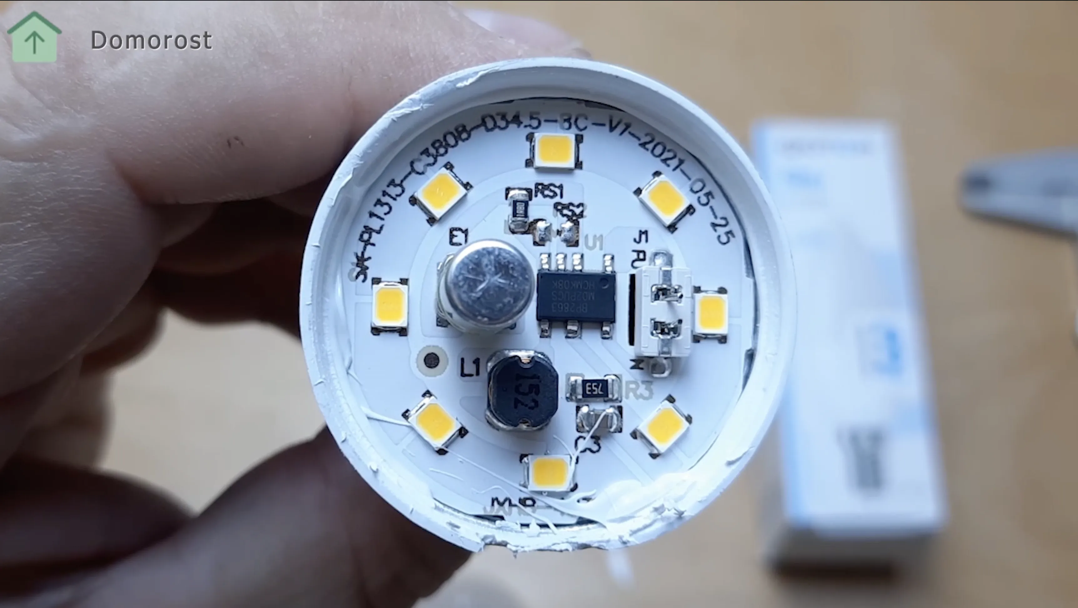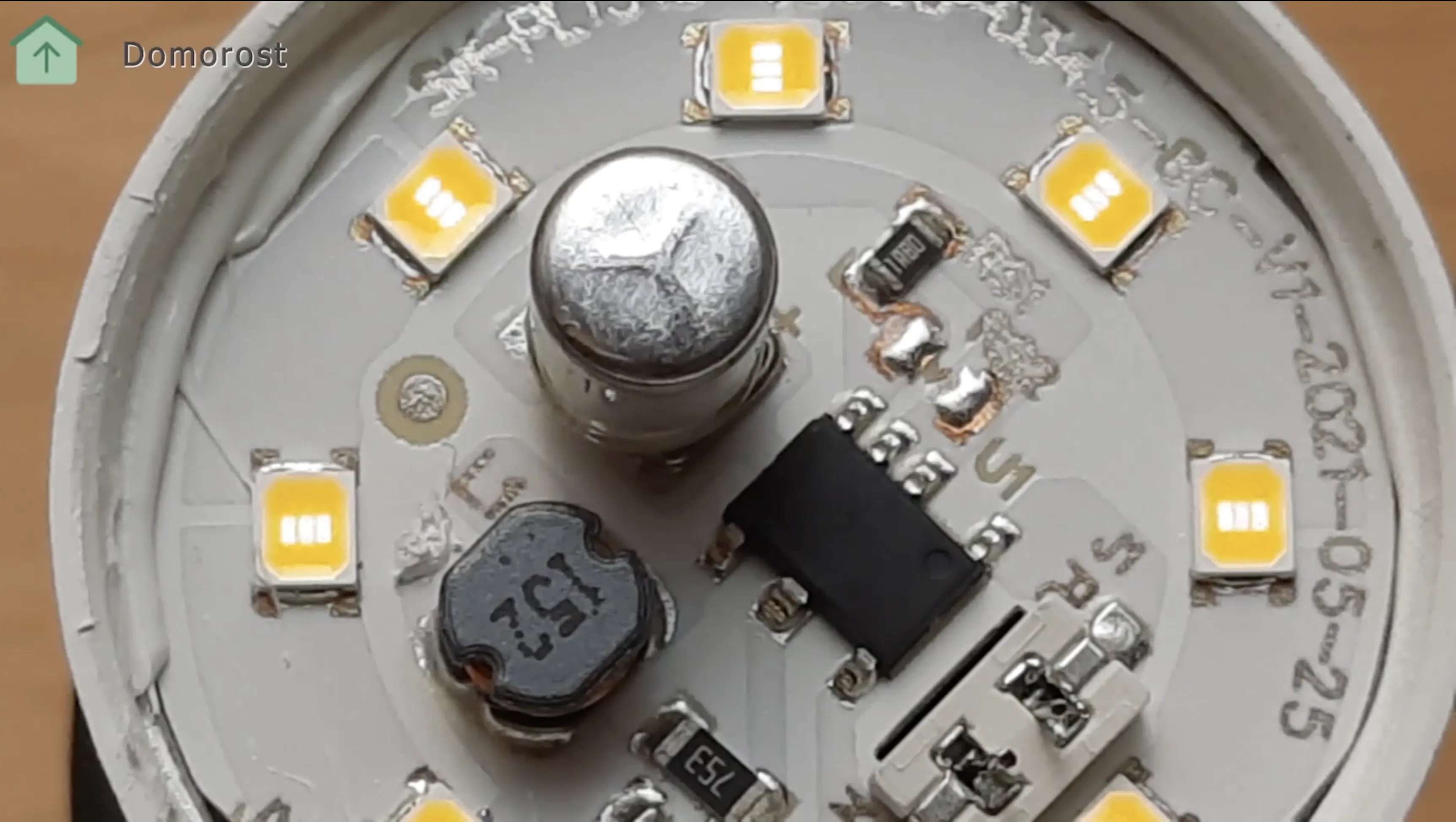 Здесь же, вместе с корпусами светодиодов на диодной плате, греется микросхема стабилизации тока и интегрированный в нее диодный мост, электролитический конденсатор 2,2 микрофарада 400 вольт на 105 градусов Цельсия и катушка на феррите. Сюда же подведено напряжение 220 вольт от цоколя лампы.