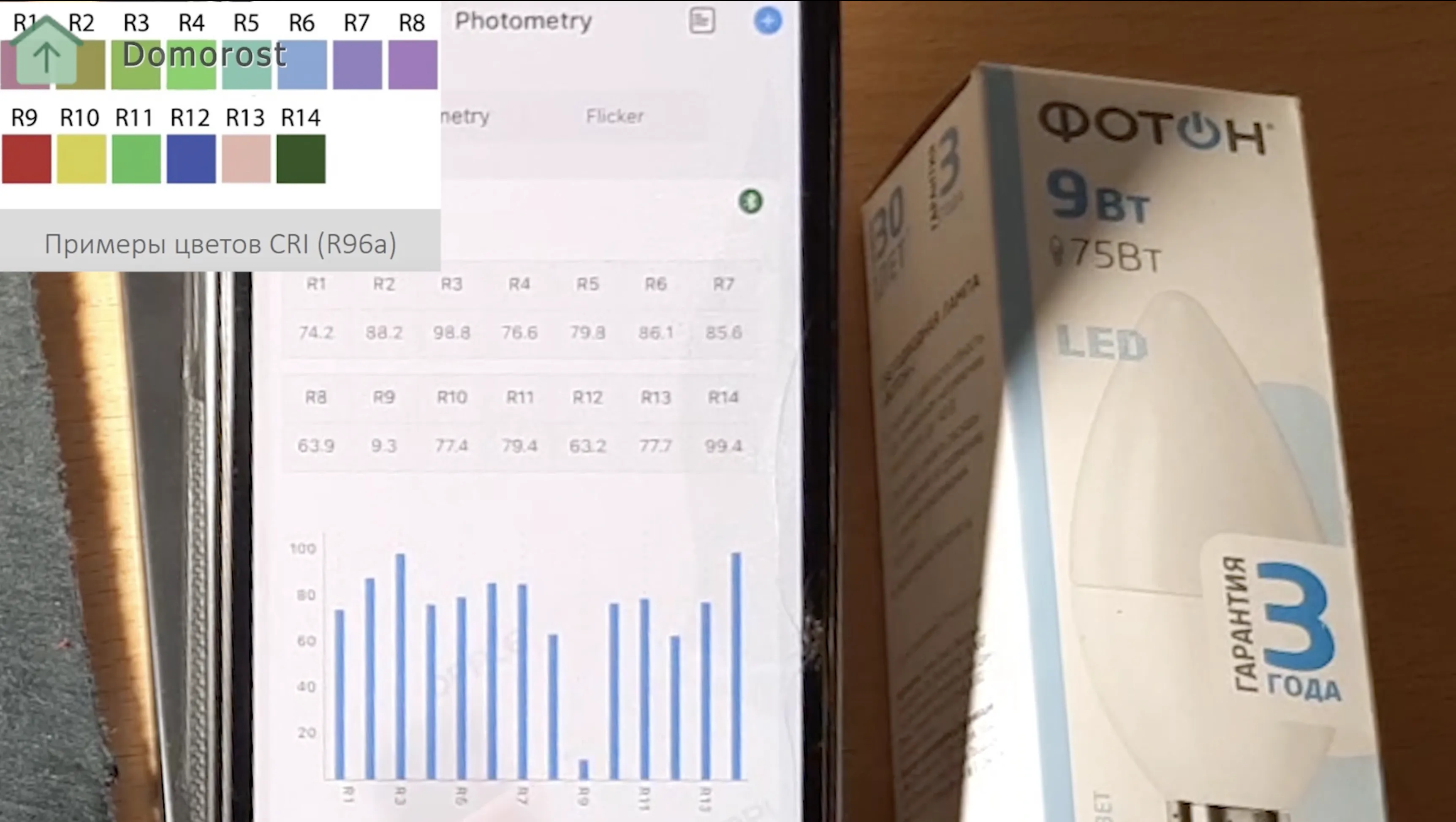 Для полной линейки цветов от R1 до R14 ни одной величины равной 100 я не вижу. Близко к 100 только R14, цвет темно-зеленого листа. Характеристикой цветопередачи у лампы всё вполне неплохо.