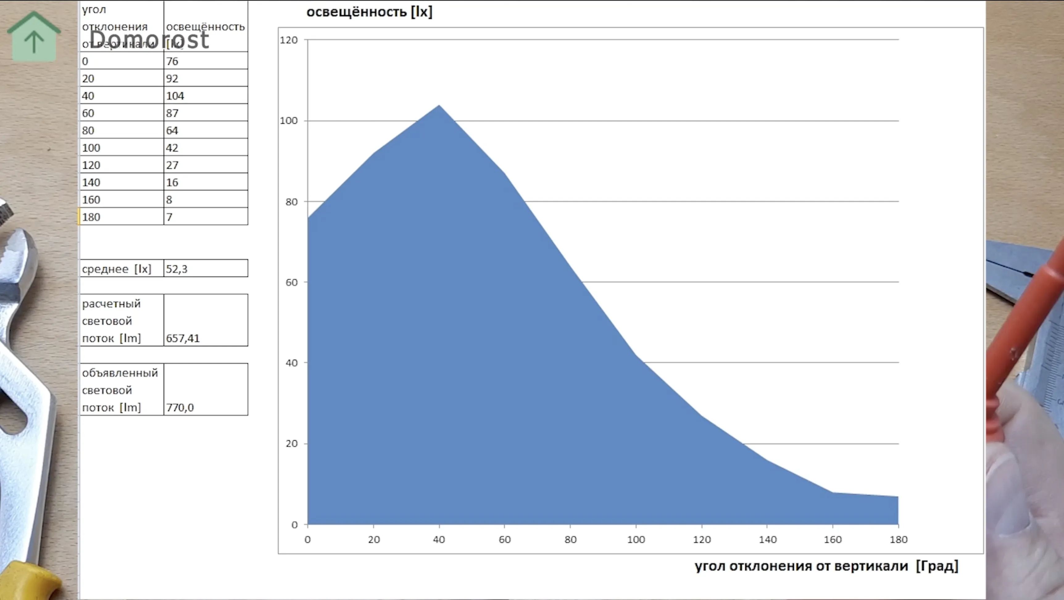Характерный провал прямо под свечкой. Световой поток, который я посчитал для этой лампы 657 Люмен. Производитель указывает 770 Люмен.