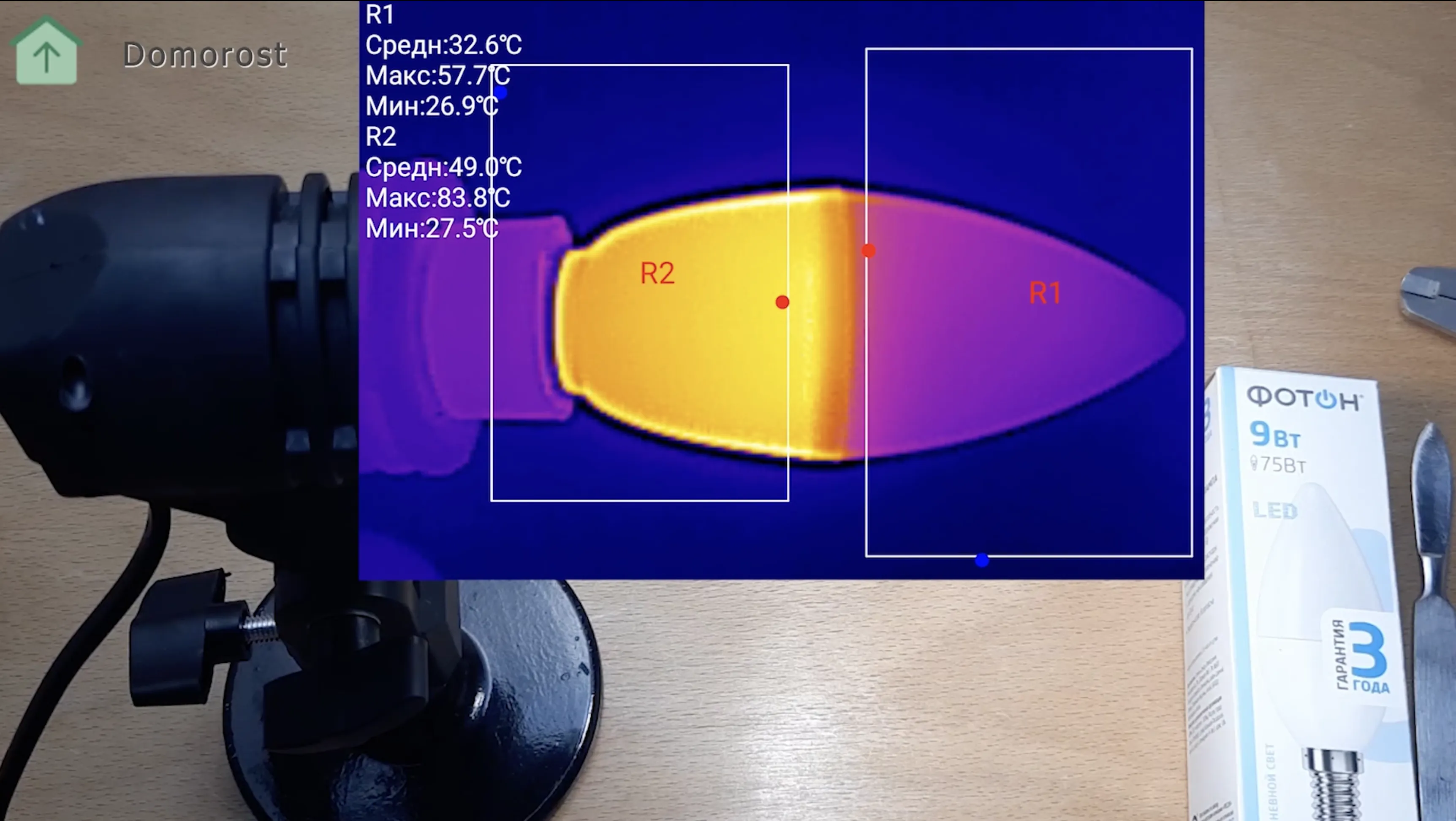 Нагрев, конечно, достаточно большой. Температура корпуса 84 градуса Цельсия, а температура колбы около 57 градусов Цельсия.