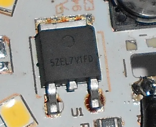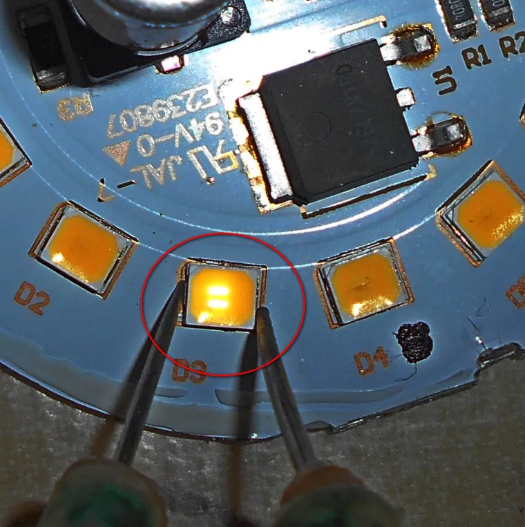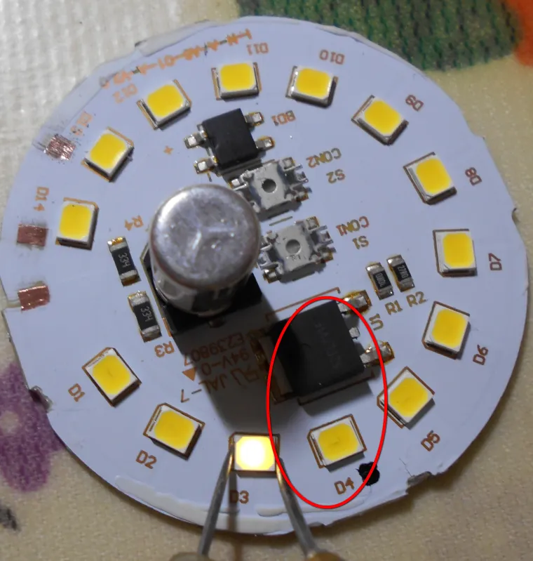 выясняю причину тусклого свечения лампы . Светодиод D4 расположен в непосредственной близости от микросхемы и он неисправен