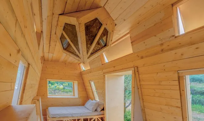 Пчеловоду помогали 17 добровольцев. А обошелся домик в 17 тысяч долларов. В сборке автор применил элементы краудфандинга, древесину ели и березы, остекление и 9 искусственных ульев, которые оригинально вписались в необычный интерьер.
