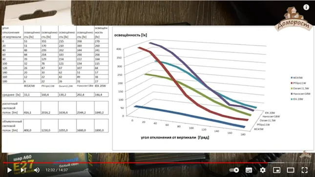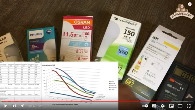 Теперь, что касается конкретных предложений... Из обзорного видео, мы увидели, что в трех из пяти случаев световой поток завышен на более чем 50%. Это значит, что по каким-то причинам были завышены измерения освещенности, также на минимум 50%.