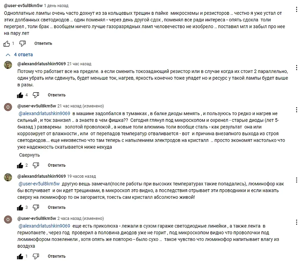 В самом первом комментарии неясно о каких трещинах идет речь. Мы их видели в лампах? Что касается поочередной замены диодов - известно же, что это плохое решение. Нужно же менять весь комплект разом. Еще неясно, насколько каждая операция по замене одного диода, снижается ресурс рабочих диодов. Тезис про компактные люминесцентные лампы 1 в 1 напоминает нашего эксперта @alex (ALEXLED).